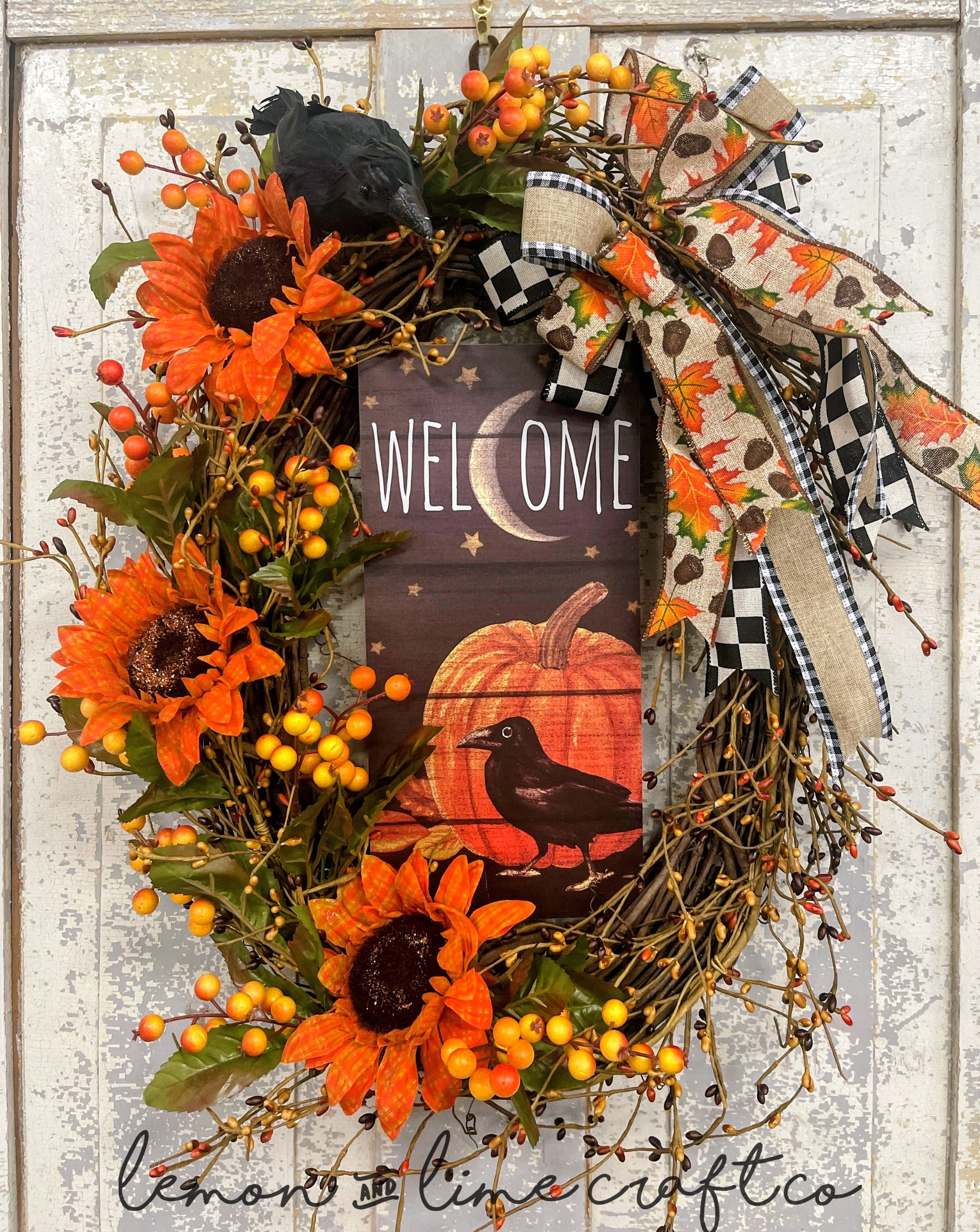 Experience the warm and rustic charm of A Crows Welcome. Our primitive looking welcome wreath features fall berries and checkered orange sunflowers, creating a timeless and inviting atmosphere. Perfect for any front door, this wreath will greet your guests with the essence of autumn.