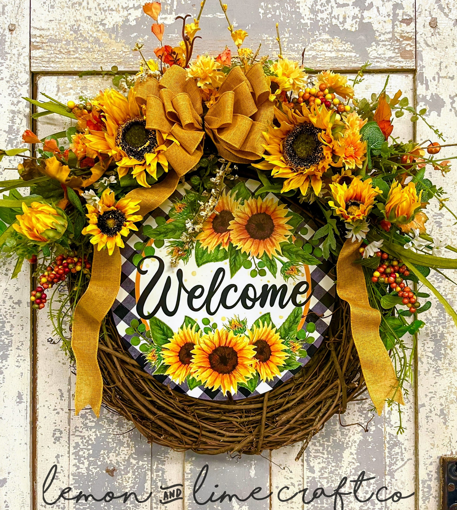 Decorate your home with Autumn's Sunflower wreath, featuring vibrant sunflowers and fall picks. The gold ribbon and bow add a touch of elegance, while the buffalo check sign adds a charming rustic element. Perfect for adding warmth and style to your fall decor.