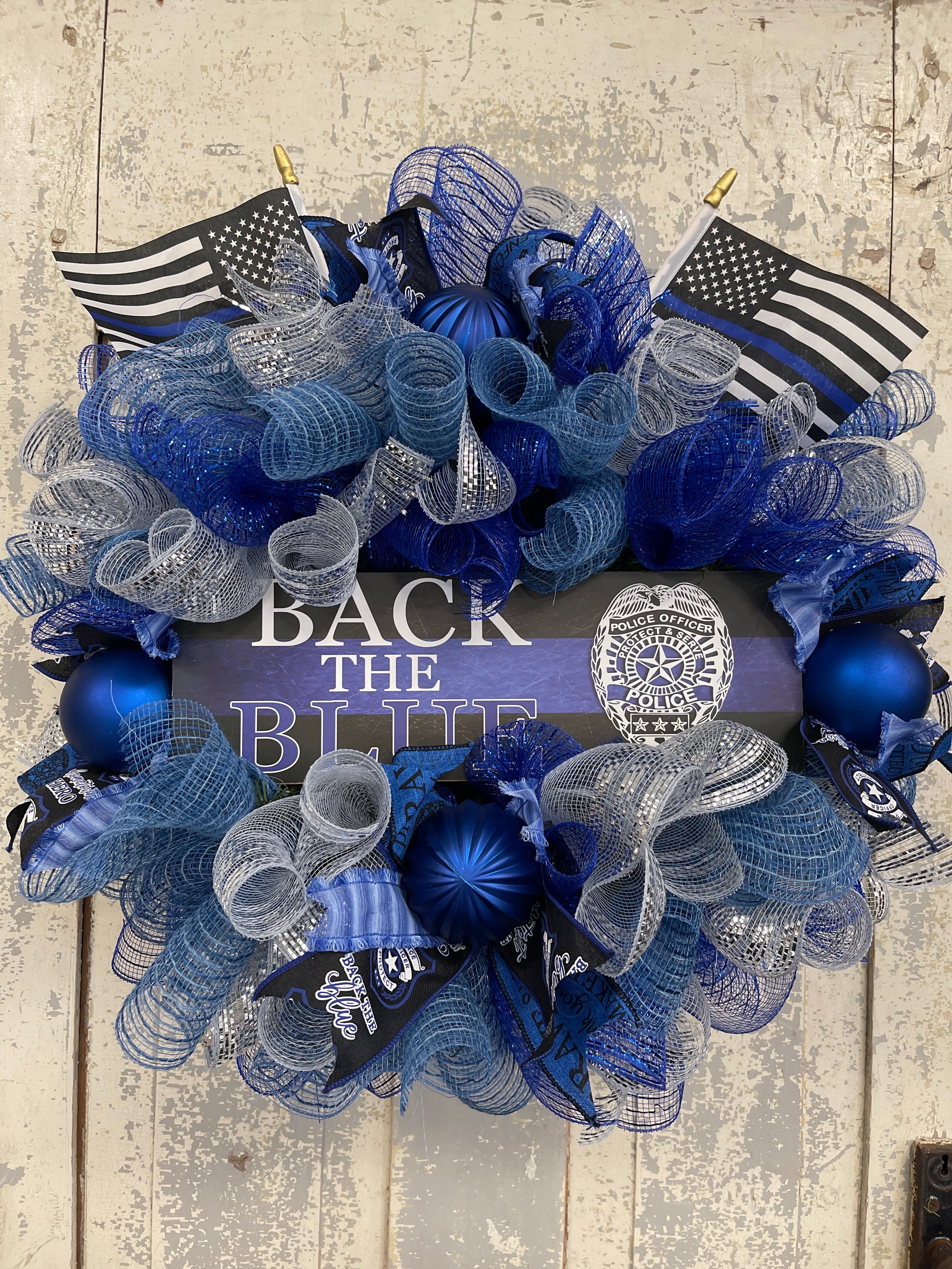 This Back the Blue wreath features a striking design with silver, light and dark blue mesh, complemented by policeman flags and ribbon accents. Show your support for law enforcement with this patriotic and elegant piece.