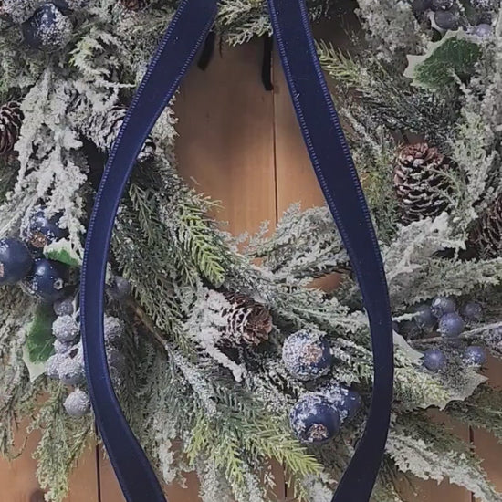Capturing the beauty of the winter season is "Berry Blue Winter". Full of snowy berries and cedary greens, this wreath is a perfect wreath for all winter long! A small velvet ribbon bow with long tails hangs in the center to add that extra touch of charm!