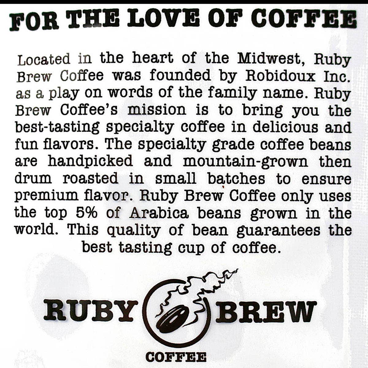 Ruby Brew Coffee is roasted with manual roasters in small batches by roastmasters trained to use their eyes, ears, and nose to determine the final roast levels. It is a medium roast that helps to preserve acidity as well as the caffeine content. Our Flavored coffee has no calories, no nutrients, and no sugar. We package using valve bags to keep oxygen out. The valve allows CO2 to escape without letting air in so the coffee remains fresh longer.
