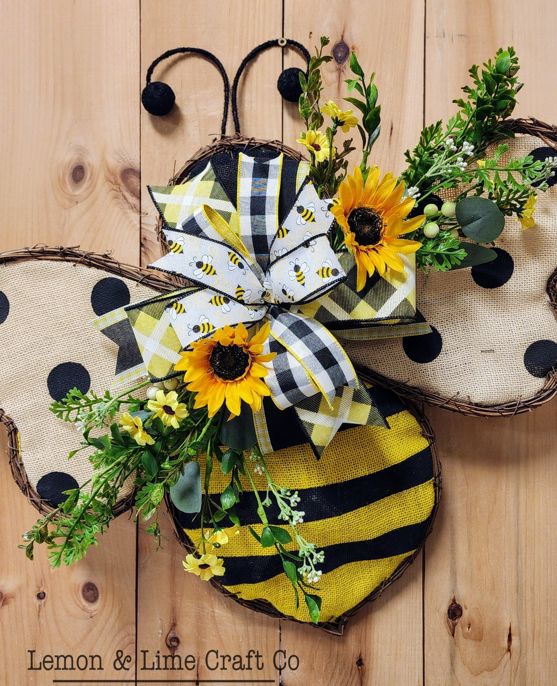 Looking for a fun alternative to a wreath this summer? Look no further! These doorhangers can stay up all summer long, are lightweight and come with a jute rope hanger so you can adjust how your bee hangs. Sitting in the center, a multi-ribbon bow of 4 quality, wired ribbons is nestled amongst beautiful sunflowers and assorted greenery. Grab this cutie for your door this summer!
