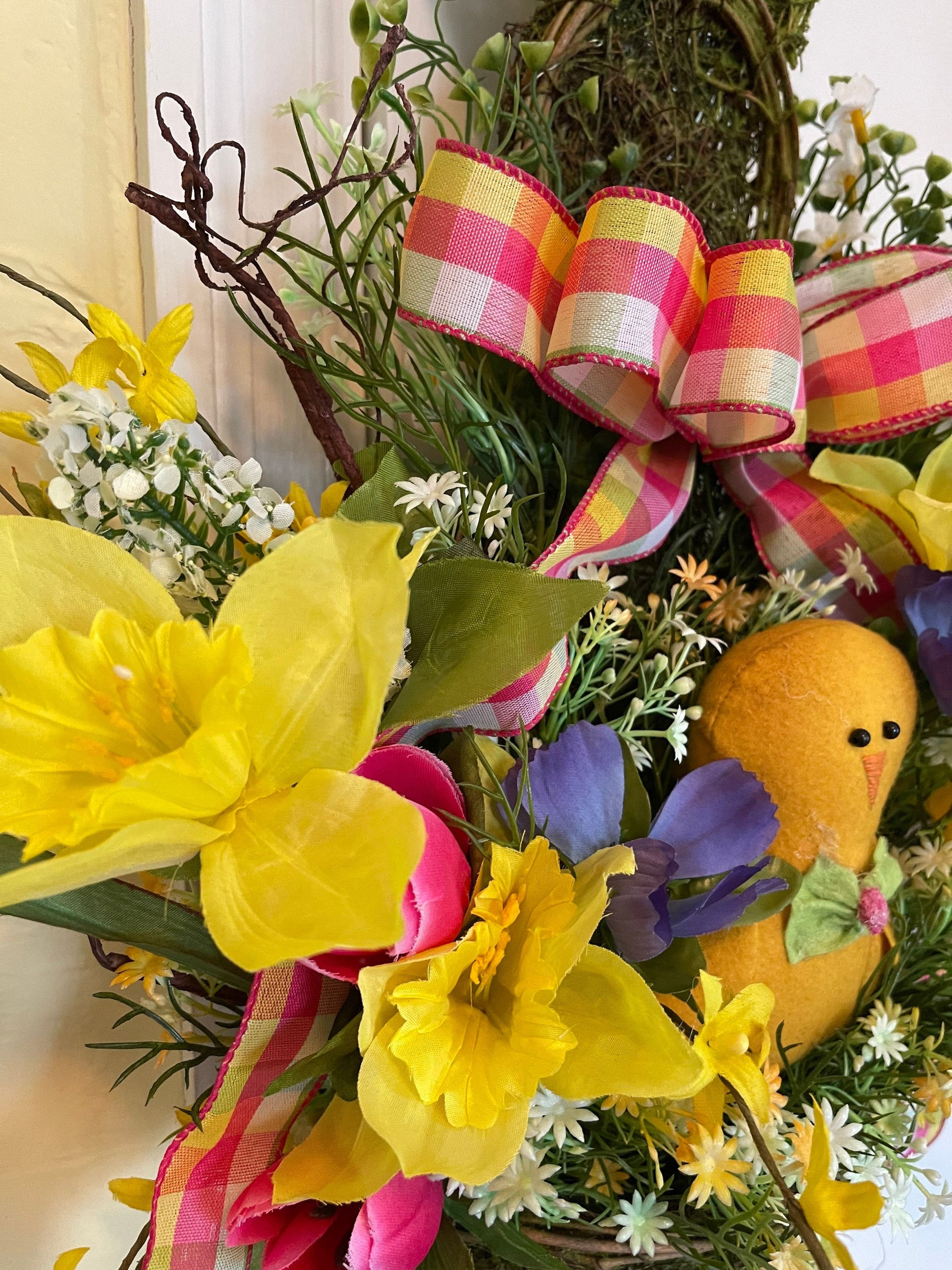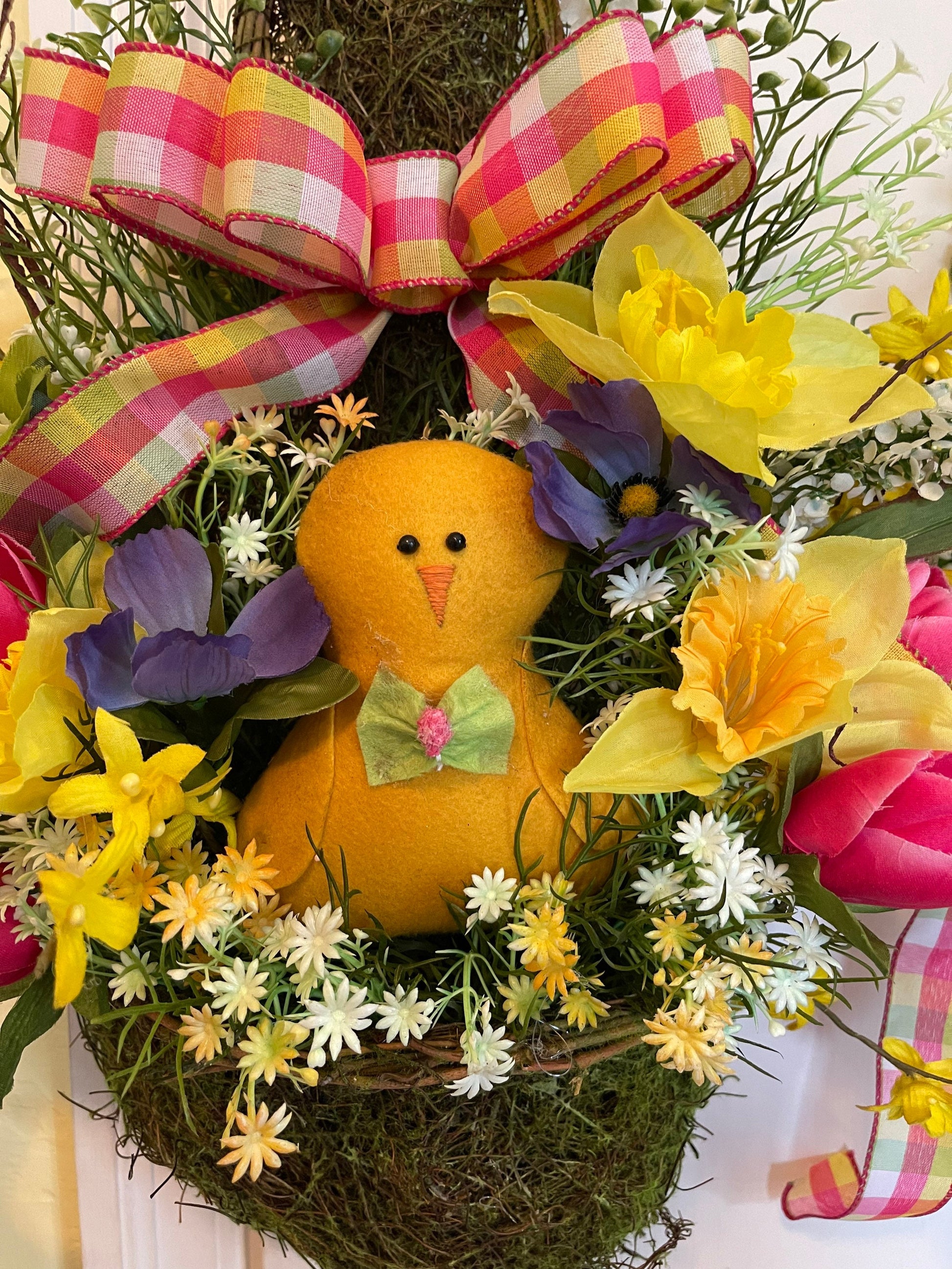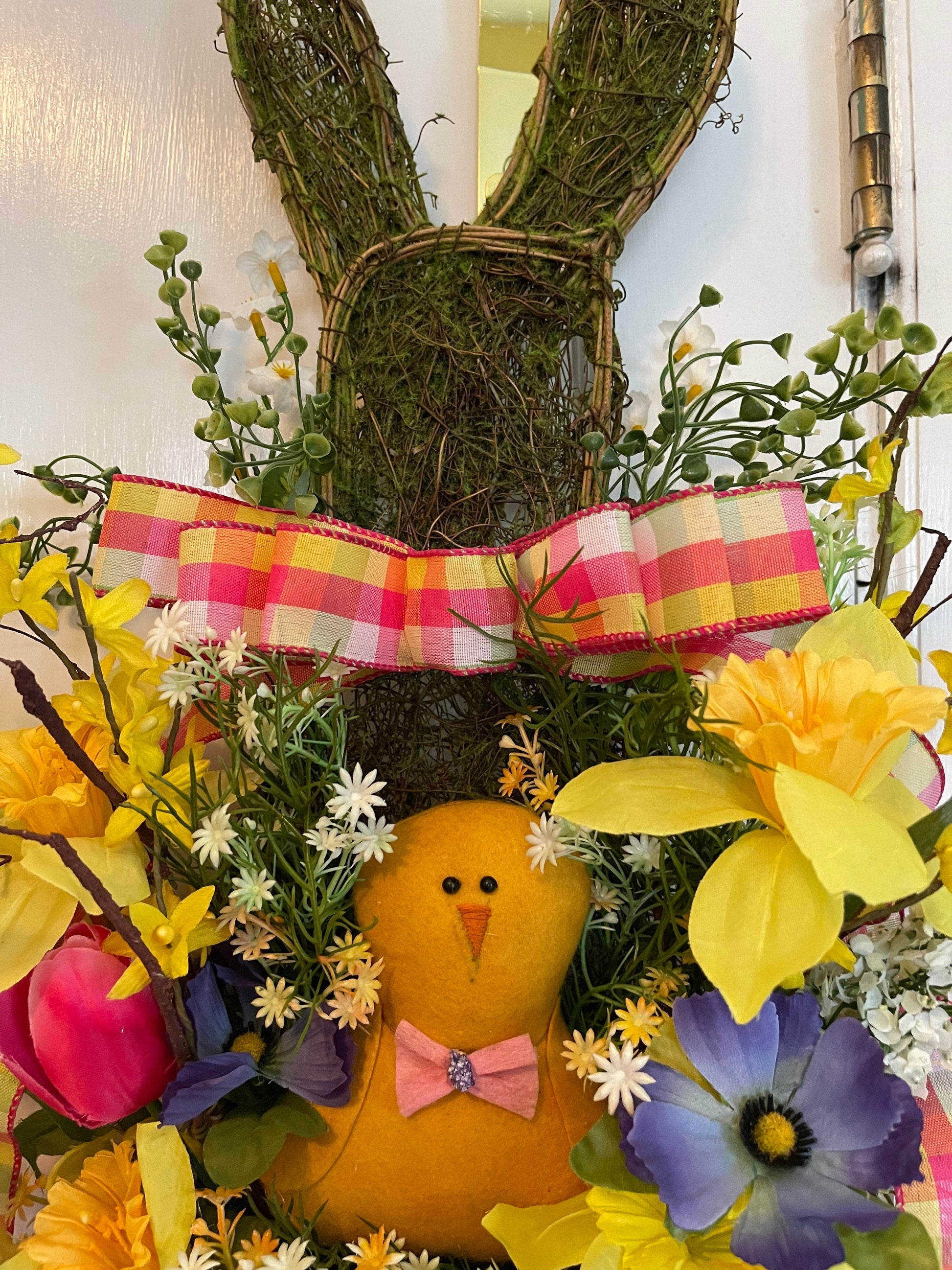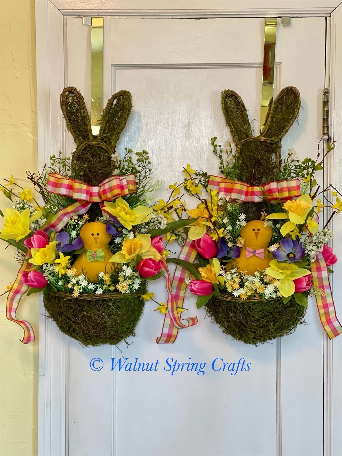 Adorable grapevine and moss-covered bunny door-hangers holding an Easter chick and all kinds of Easter floral and springtime greens. The running bow has all of the Easter colors represented! These are made for a double door set but I will sell them individually.