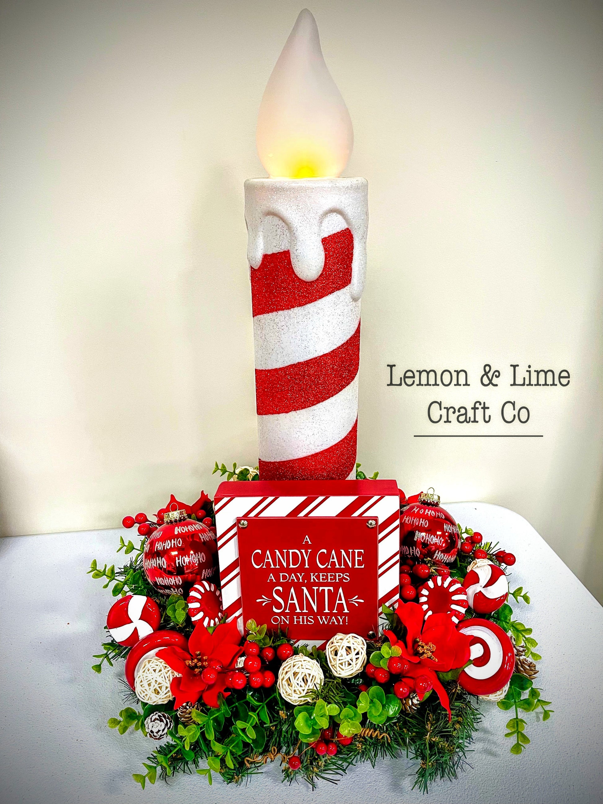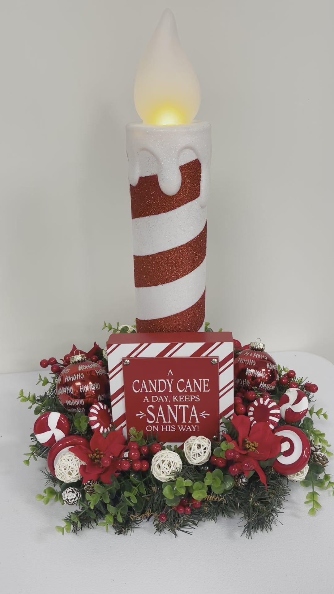This festive Candy Cane Santa Candle is sure to add a touch of holiday cheer to your home. The Blow Mold candle features a red and white striped design, an evergreen base, peppermint picks, HO HO HO bulbs, winter greens, and poinsettias for a complete look. Celebrate the season in style with this delightful Christmas decoration.