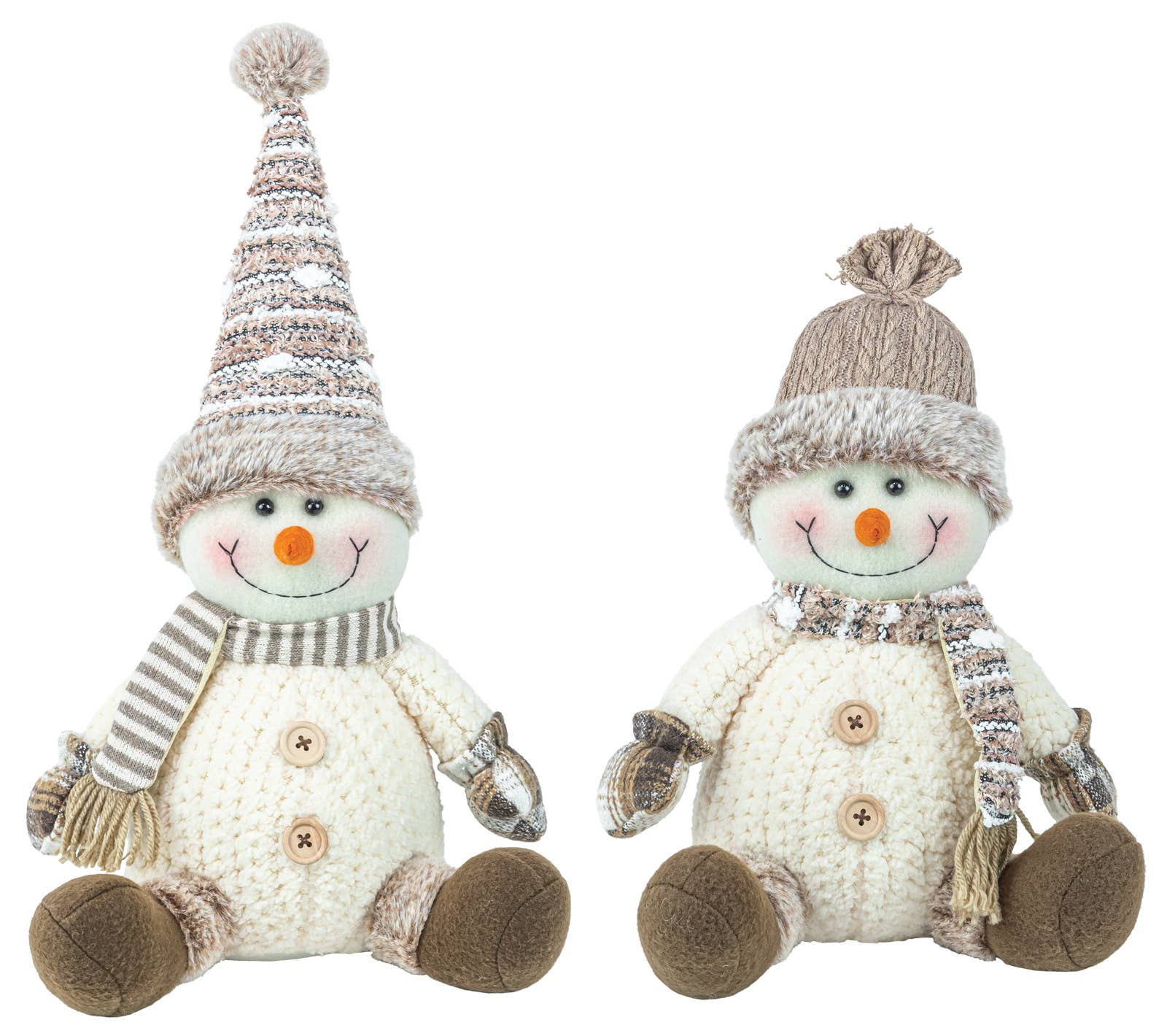 Warm up your holiday décor with this cozy pair of snowman sitters dressed in creamy neutrals and cocoa-brown accents! Each plush snowman features ultra-soft fabric, embroidered smiles, and charming details like knitted scarves, button accents, and cozy stocking caps. Their weighted bottoms keep them perfectly perched on mantels, shelves, or coffee tables, adding a touch of understated winter charm.