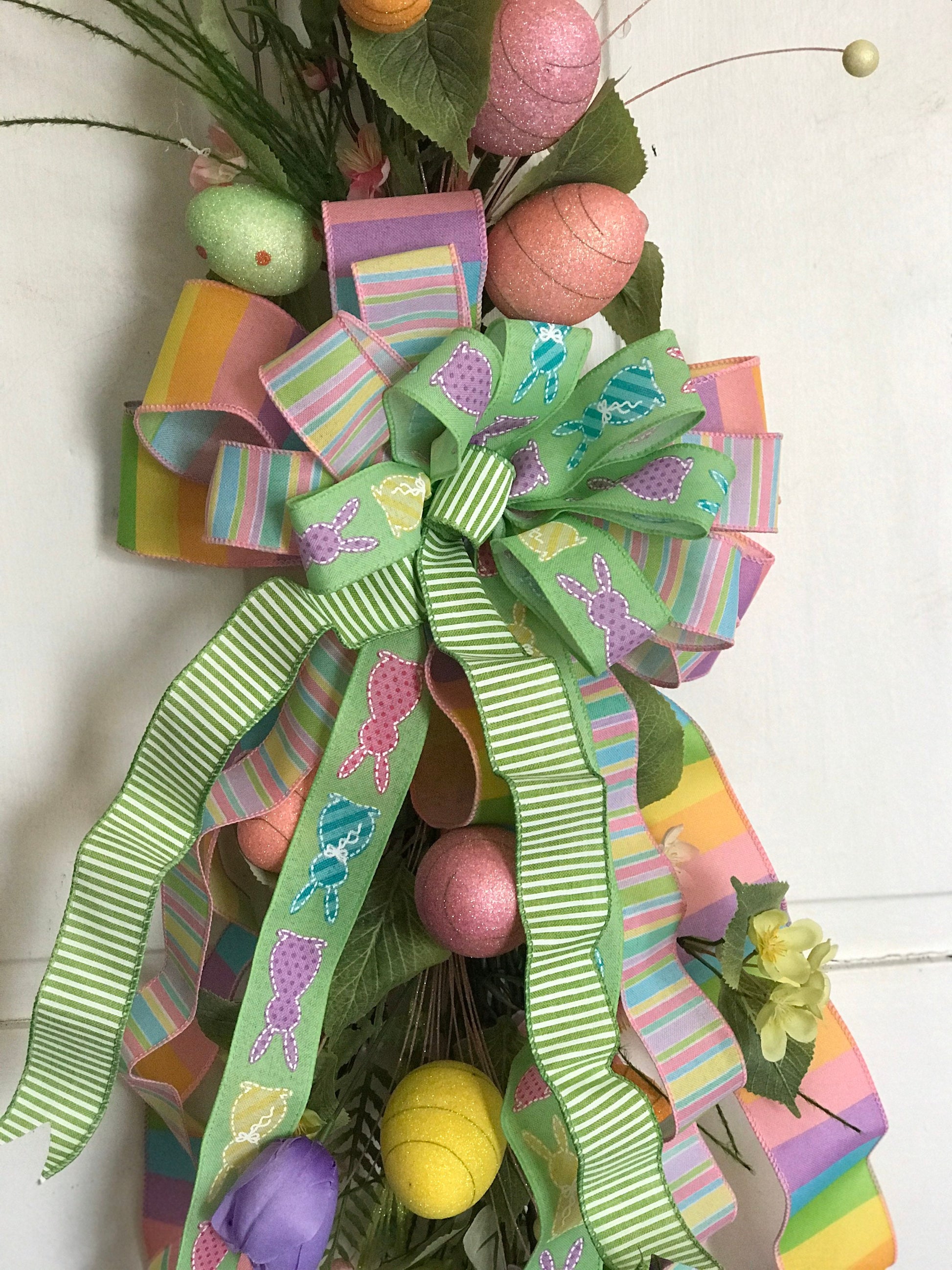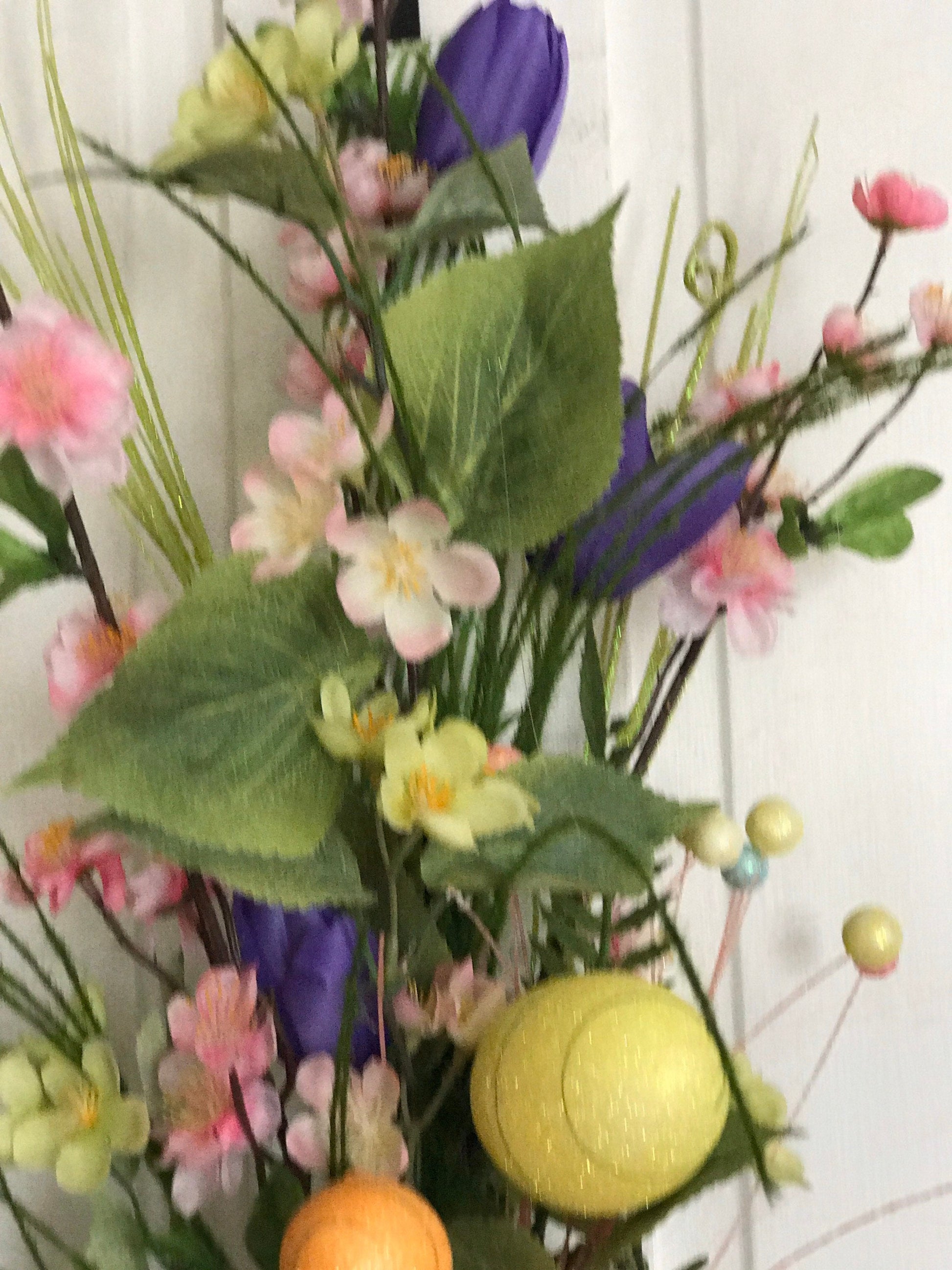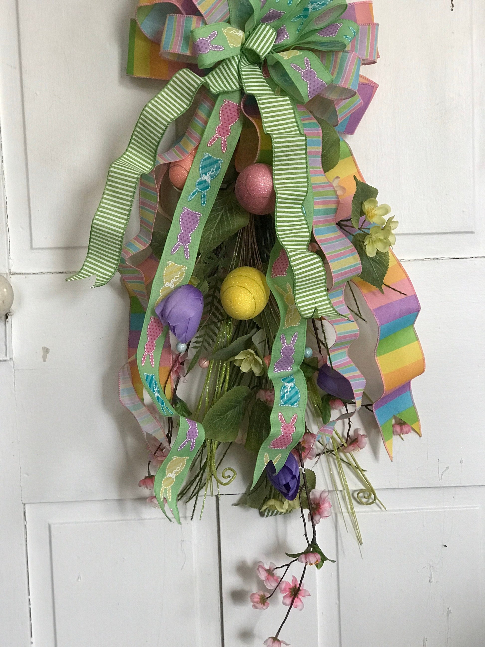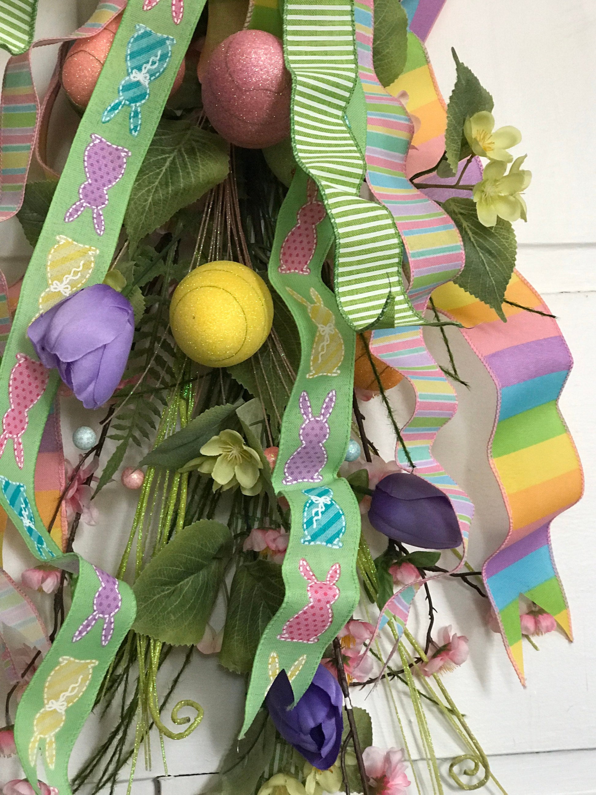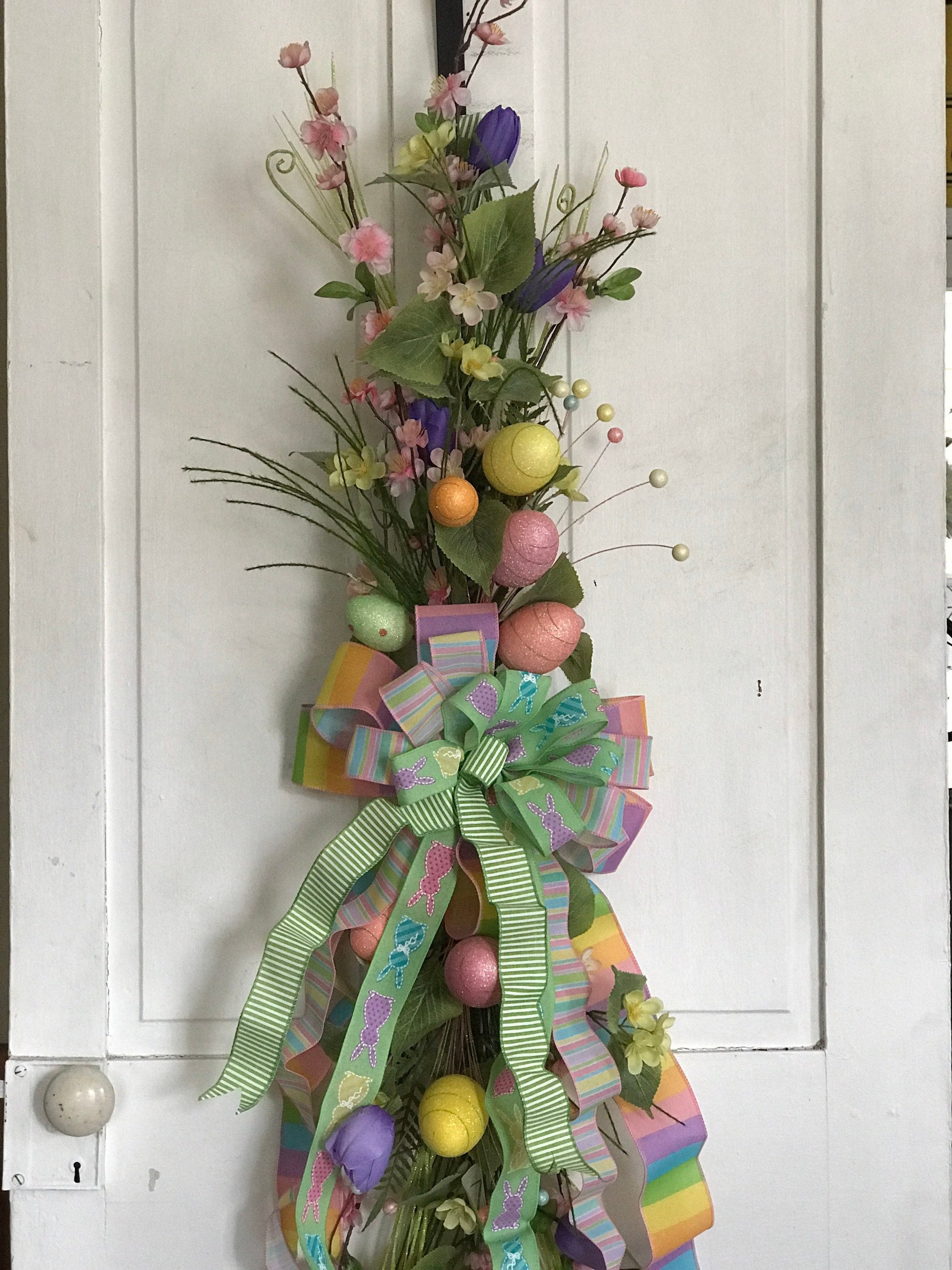 This door hanger is approximately a yard long. It is loaded with all of the pretty Easter colors of pinks, purples, yellows, blues and greens! A large multi ribbon holiday bow is front and center! An Easter egg spray, cherry blossom stems and purple tulips surround the bow top and bottom. This would make a beautiful alternative to a wreath for your holiday door.