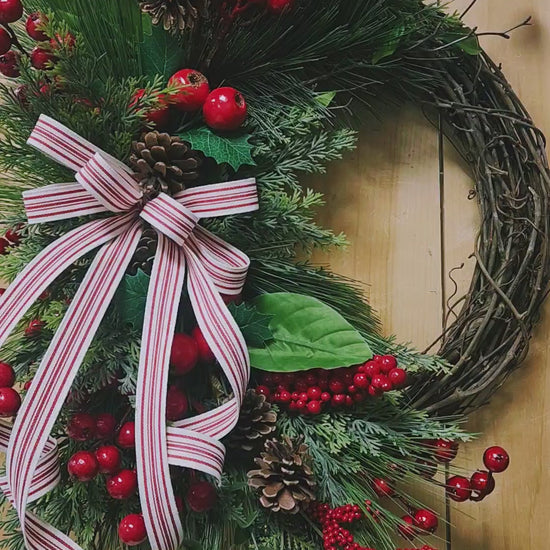 Lose the winter blues with this beautiful farmhousey wintry wreath! Chock full of faux greens like cedars and pines with a plethora of red berries, this wreath is perfect for all winter long! Sitting on a 14" grapevine, this frame not only makes it easier to fit in more spaces, it's also easier on the wallet!