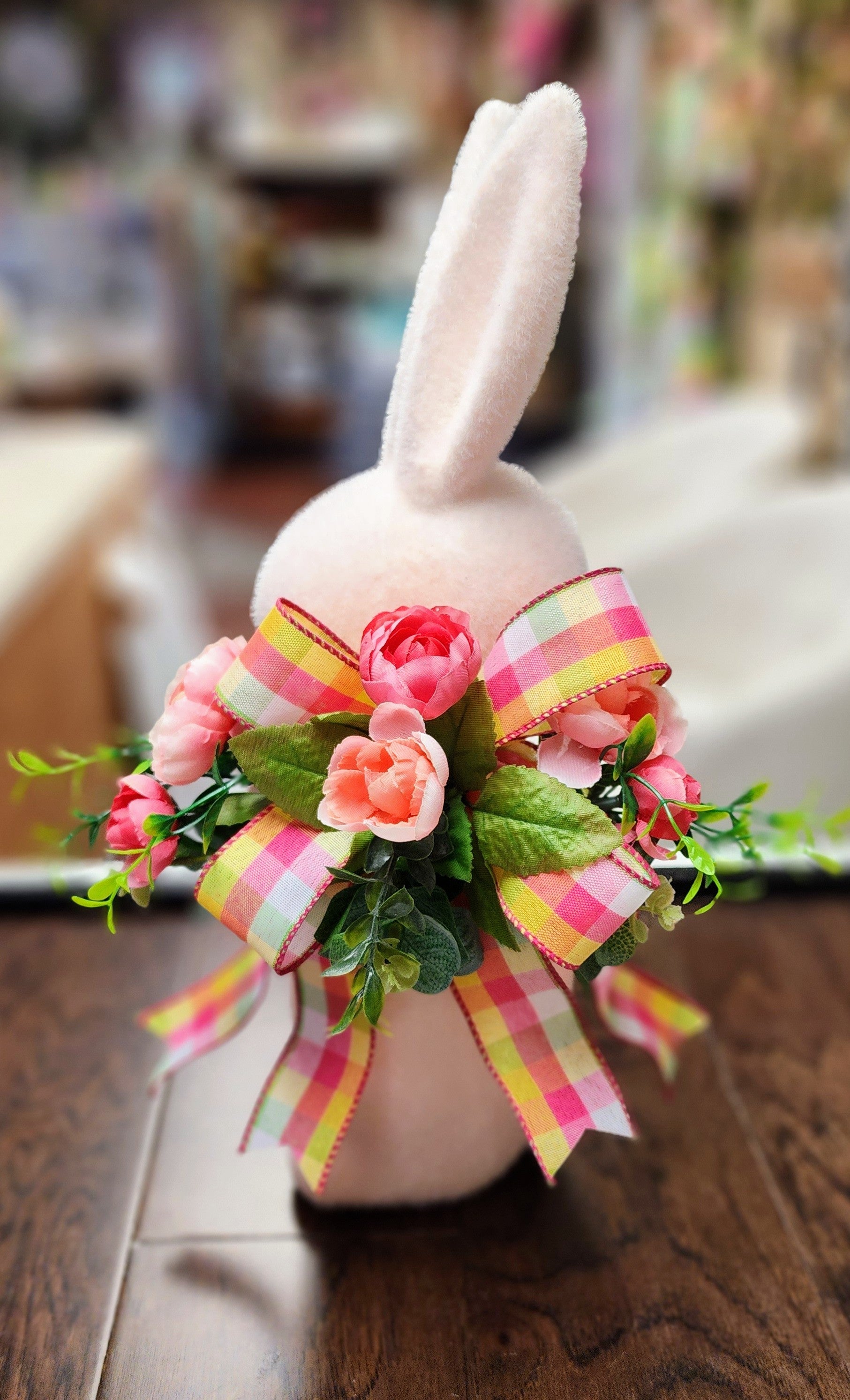 Flocked bunny with bow and florals, a perfect Easter accent to your decor!