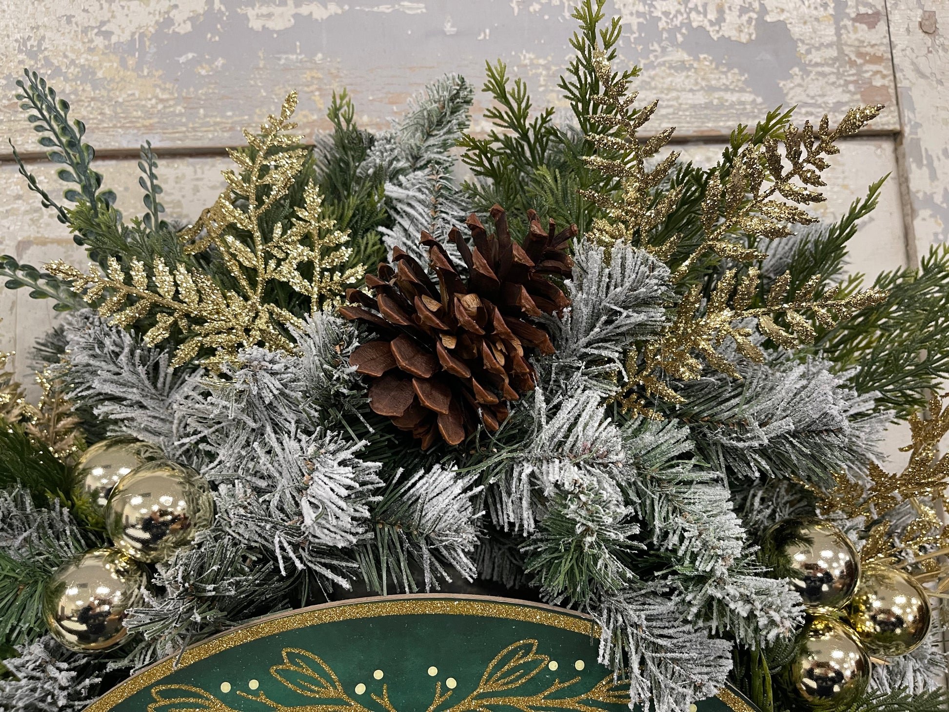 Expertly designed Christmas wreath with snowy pine, cedar picks, and winter grasses for a festive touch. Adorned with gold glitter ferns, gold ball ornaments, a 3 ribbon bow, and pinecones for a hint of holiday shine. Welcome the season with this Green and Gold Merry Christmas wreath.