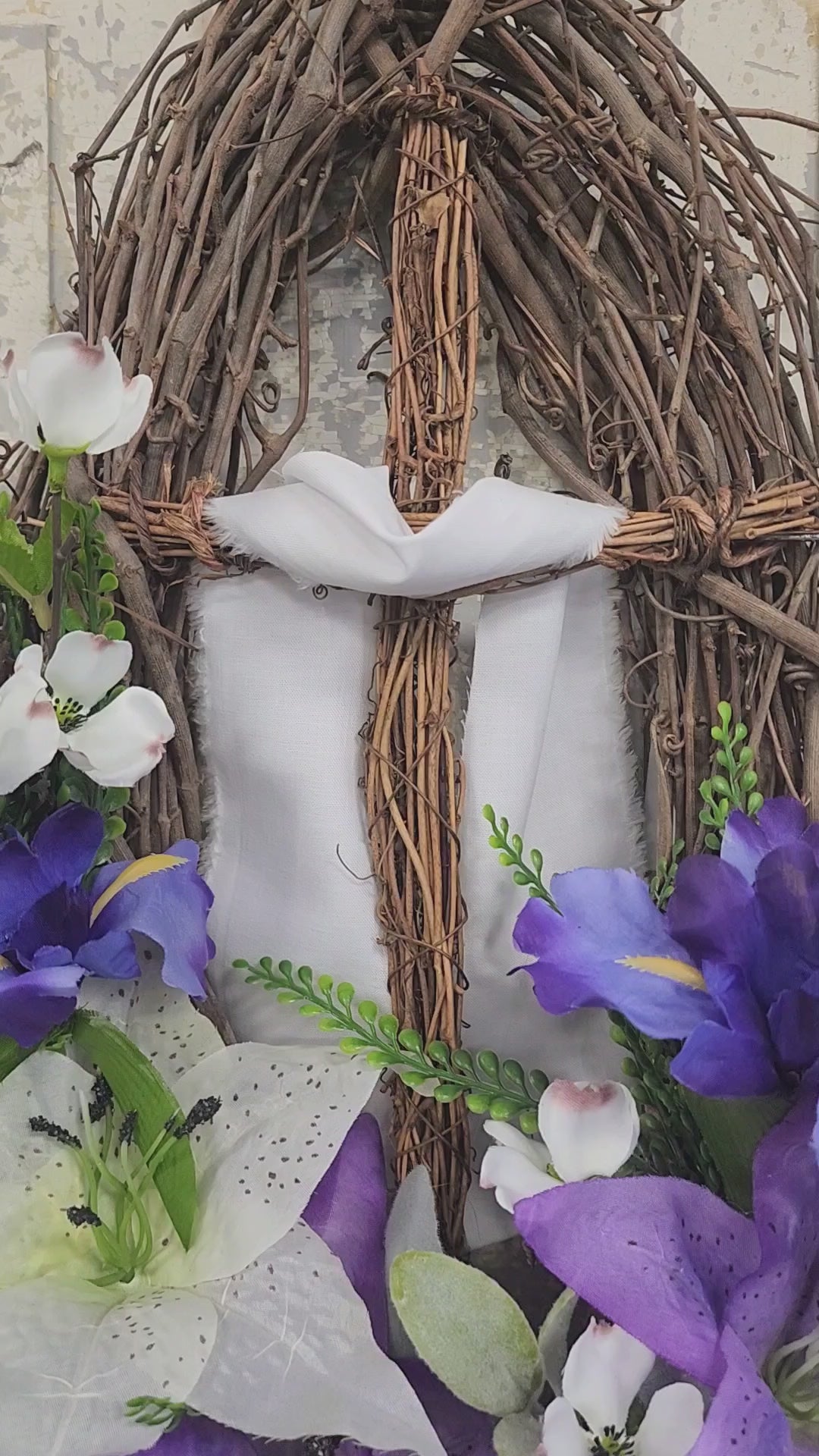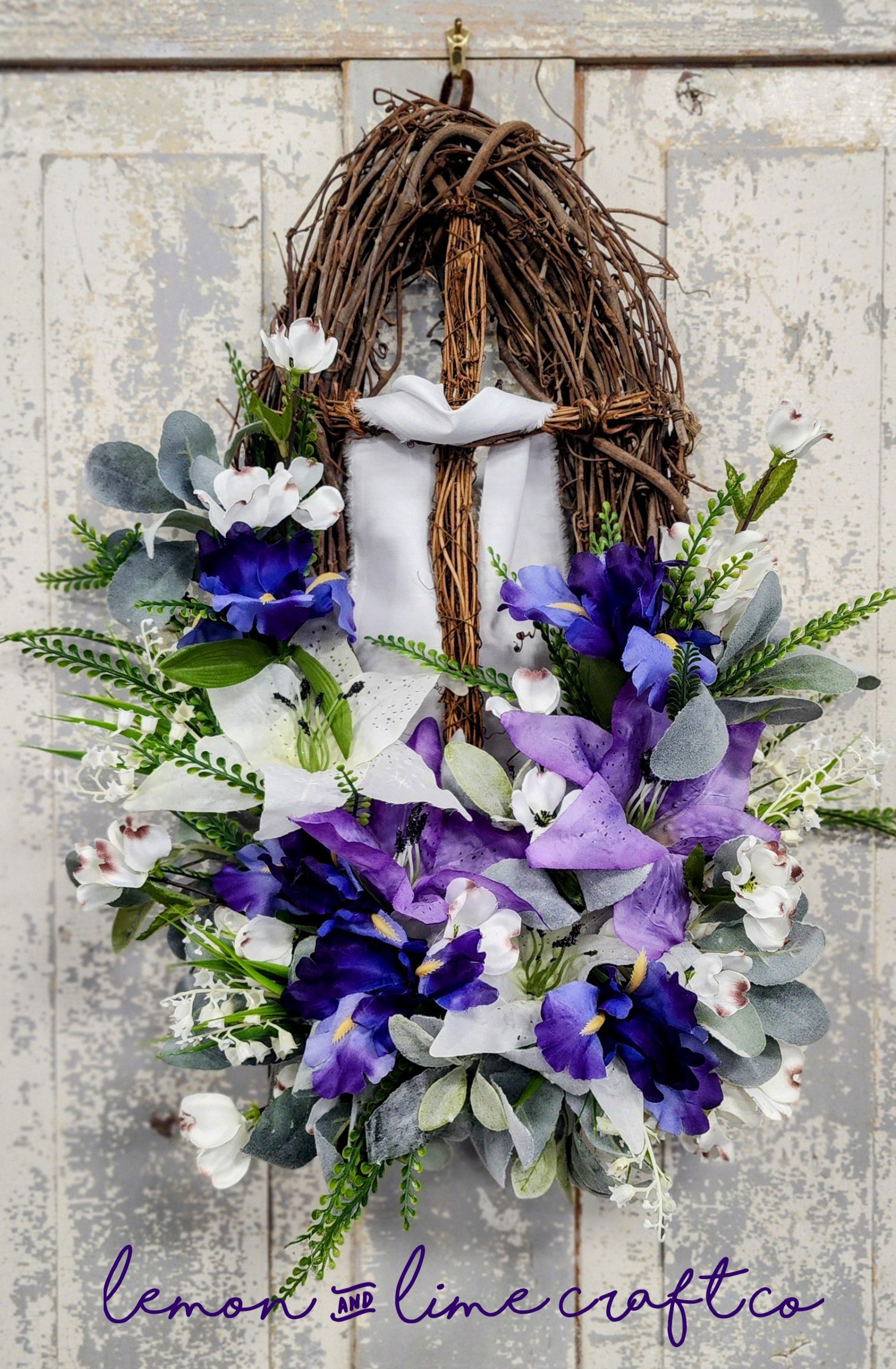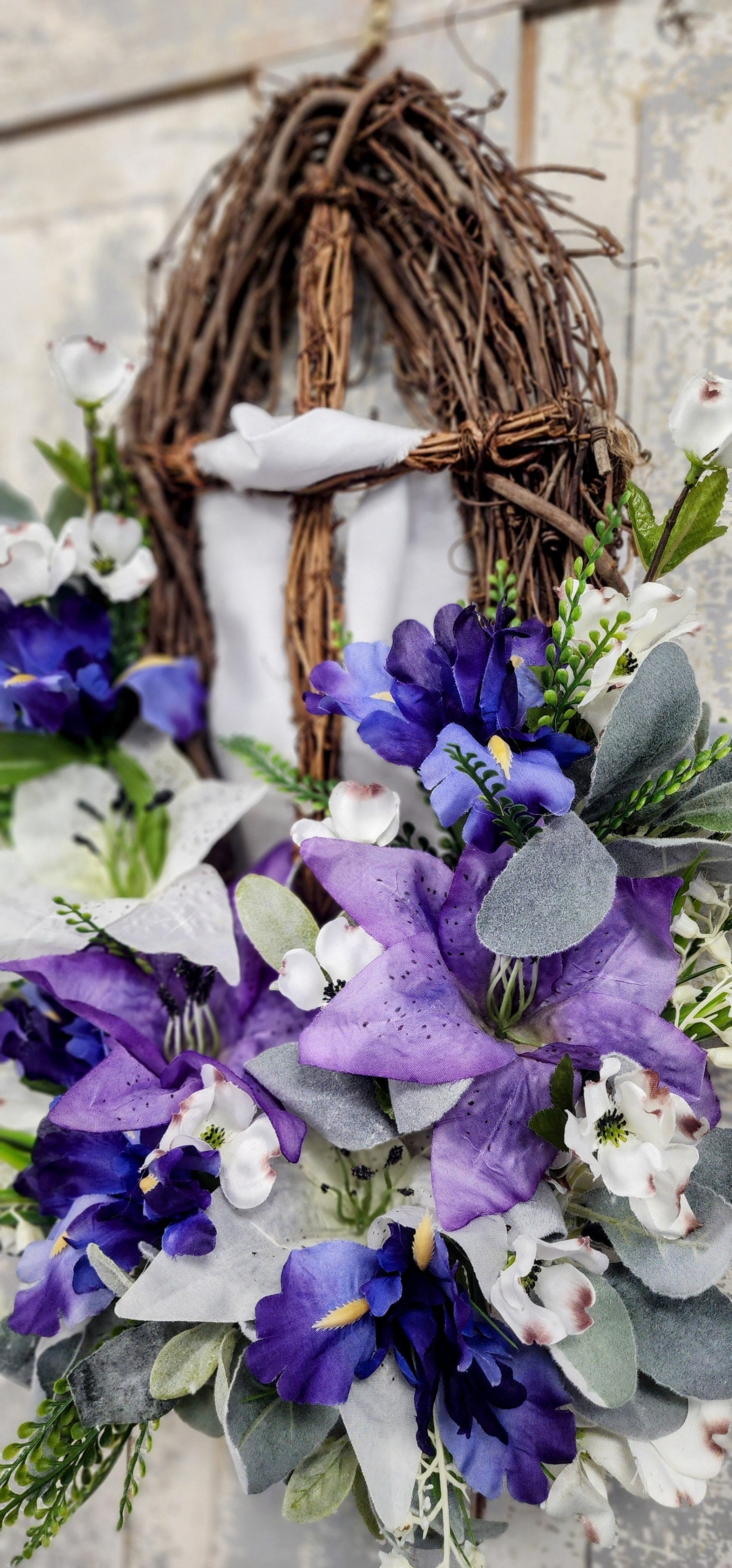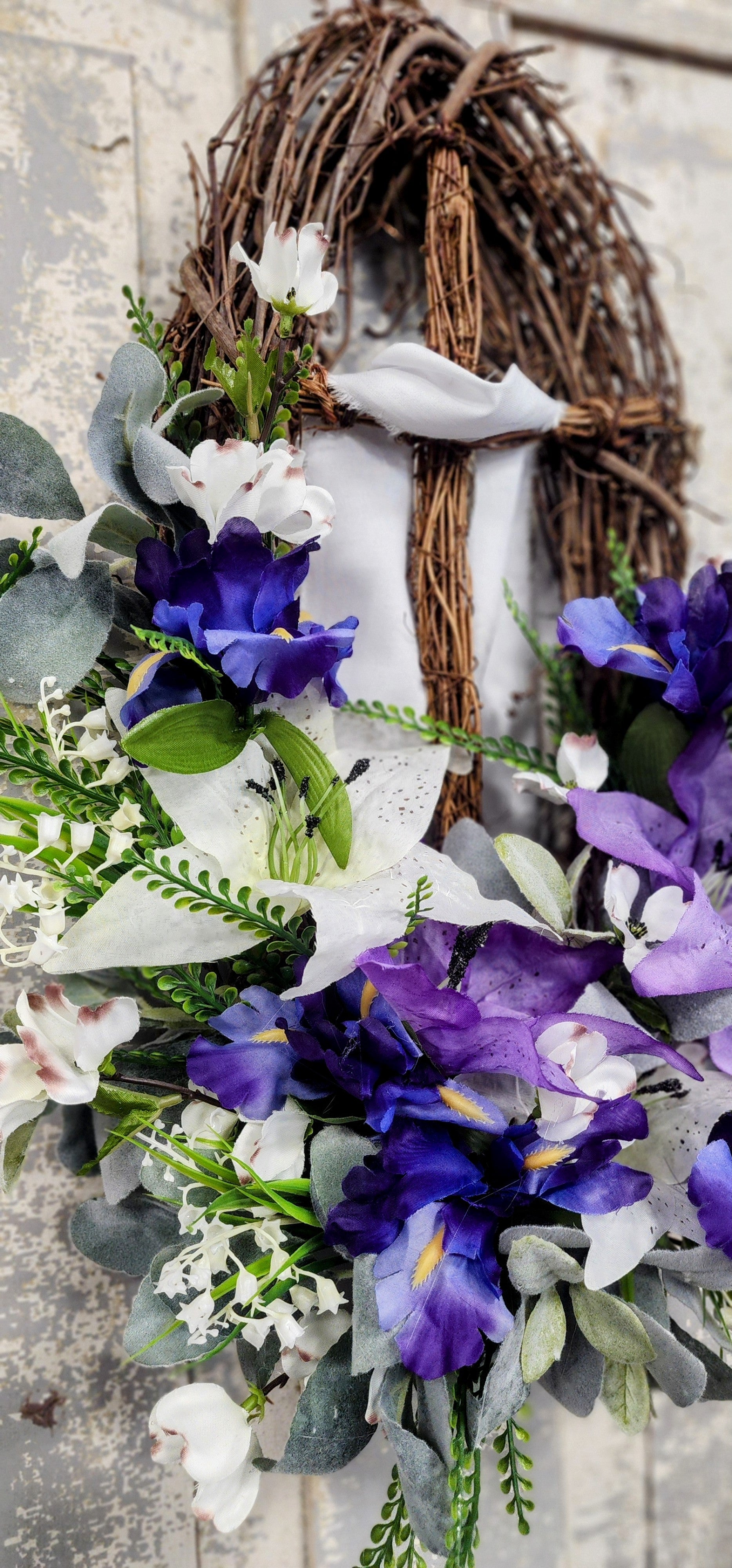 Expertly crafted with a grapevine cross and dogwood branches, surrounded by vibrant purple and white lillies, grass picks, and soft lambs ear, "He Has Risen" is the perfect symbol of hope and renewal. Bring a touch of natural beauty into your home with this exquisite grapevine oval wreath.
