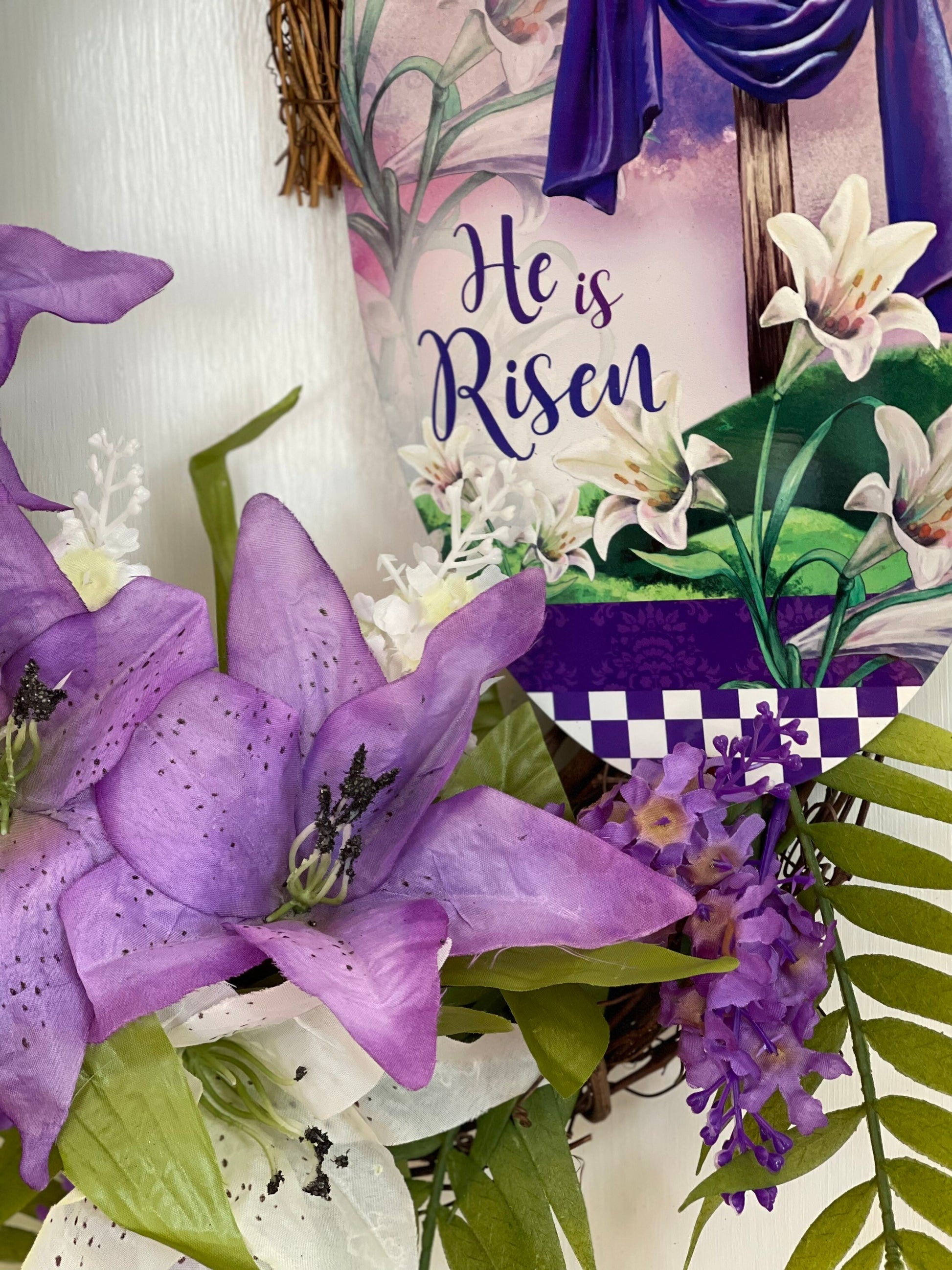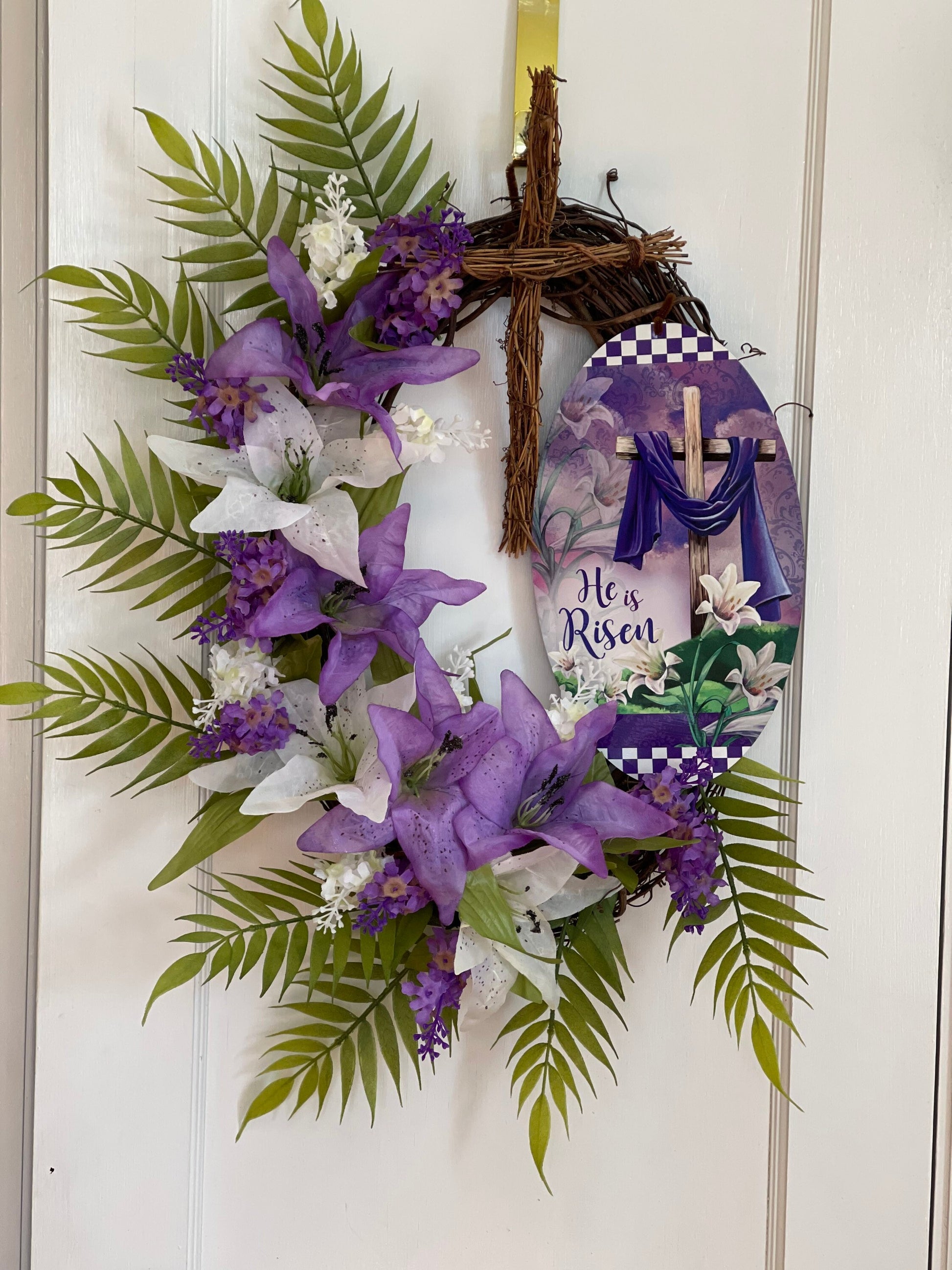 Perfect small wreath which addresses the reason for the season!! This is a 14 inch grapevine base with palm leaves and purple and white lilies framing a beautiful tin sign with the cross and purple sheath. An additional grapevine cross is atop this wreath for additional detail.