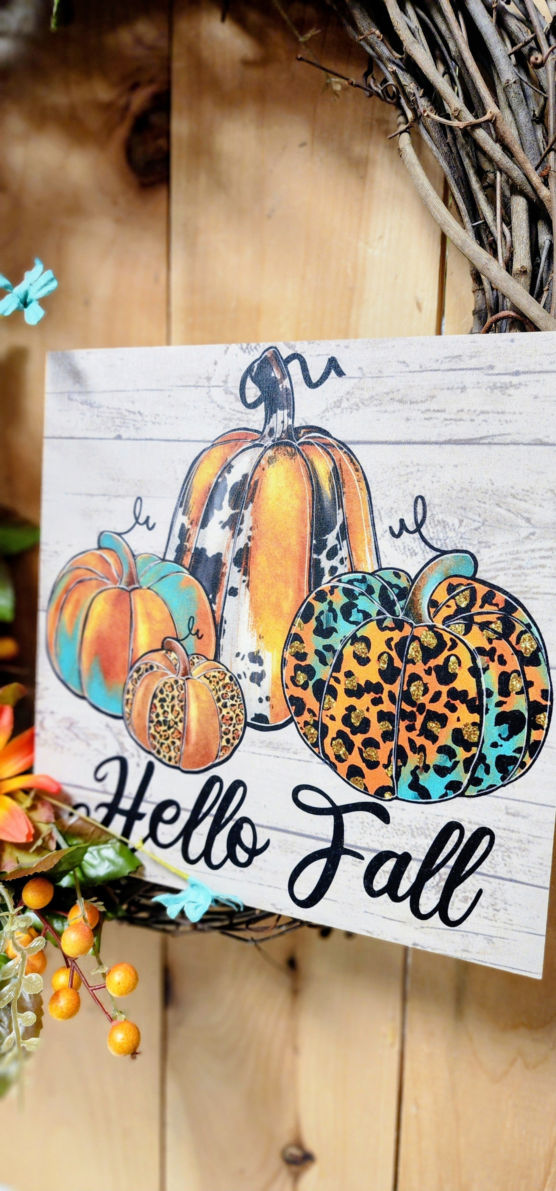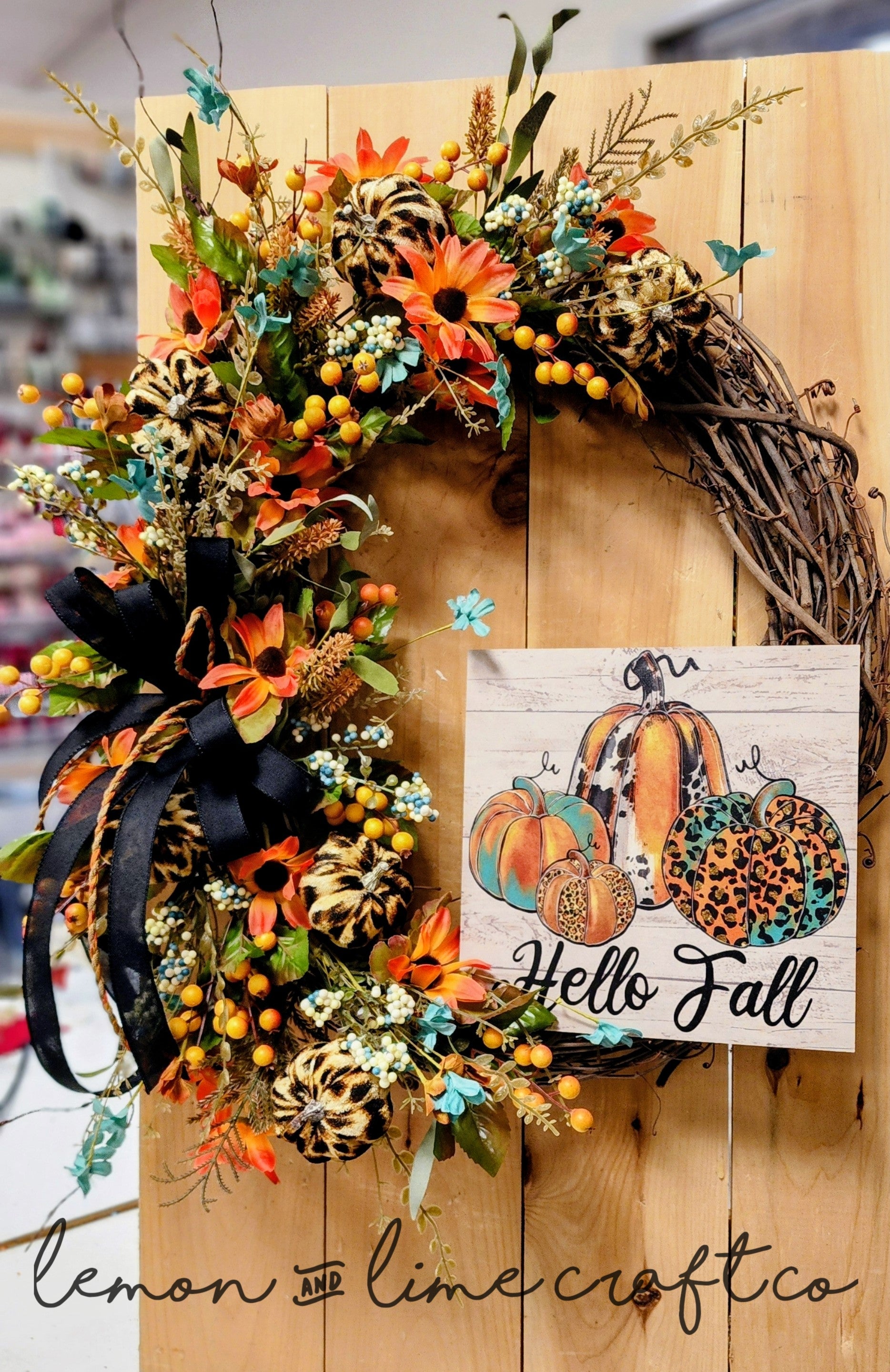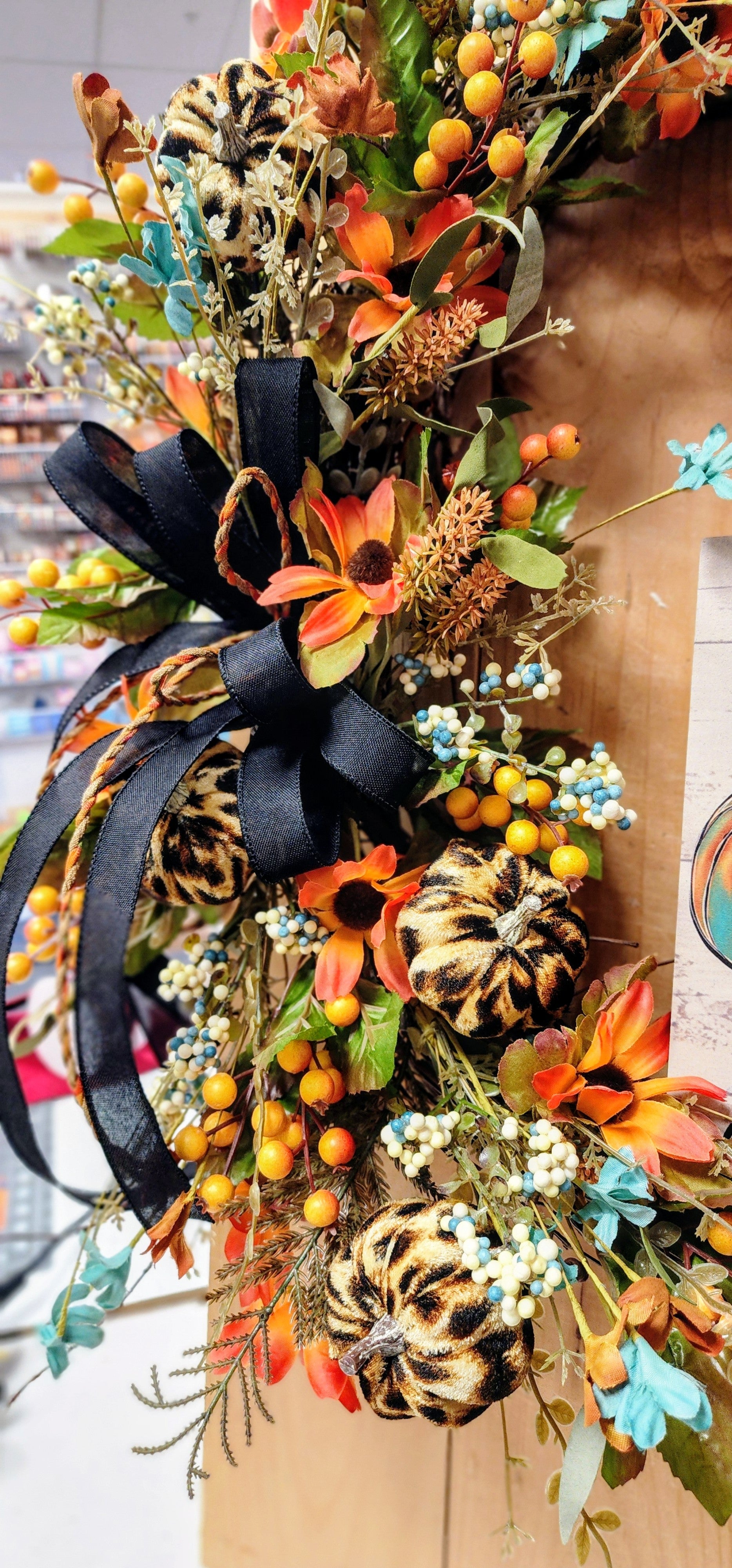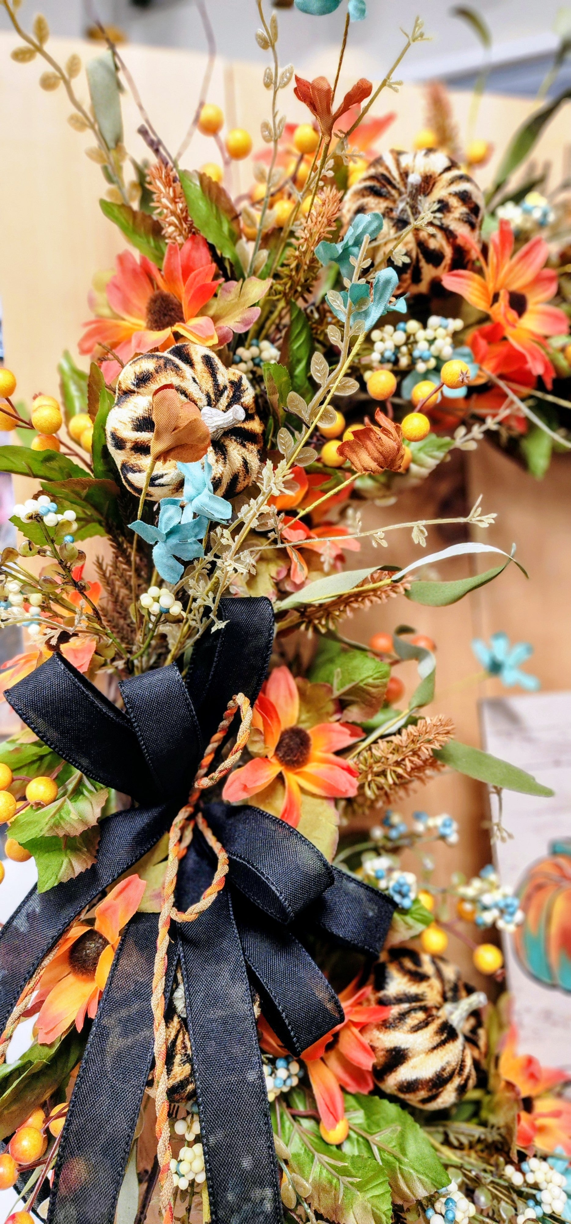 The perfect Fall wreath for the leopard print lover! Featuring touches of teal with a blend of traditional fall favorites, a simple bow, and a complimentary sign, this wreath would be a lovely addition to your Fall decor.
