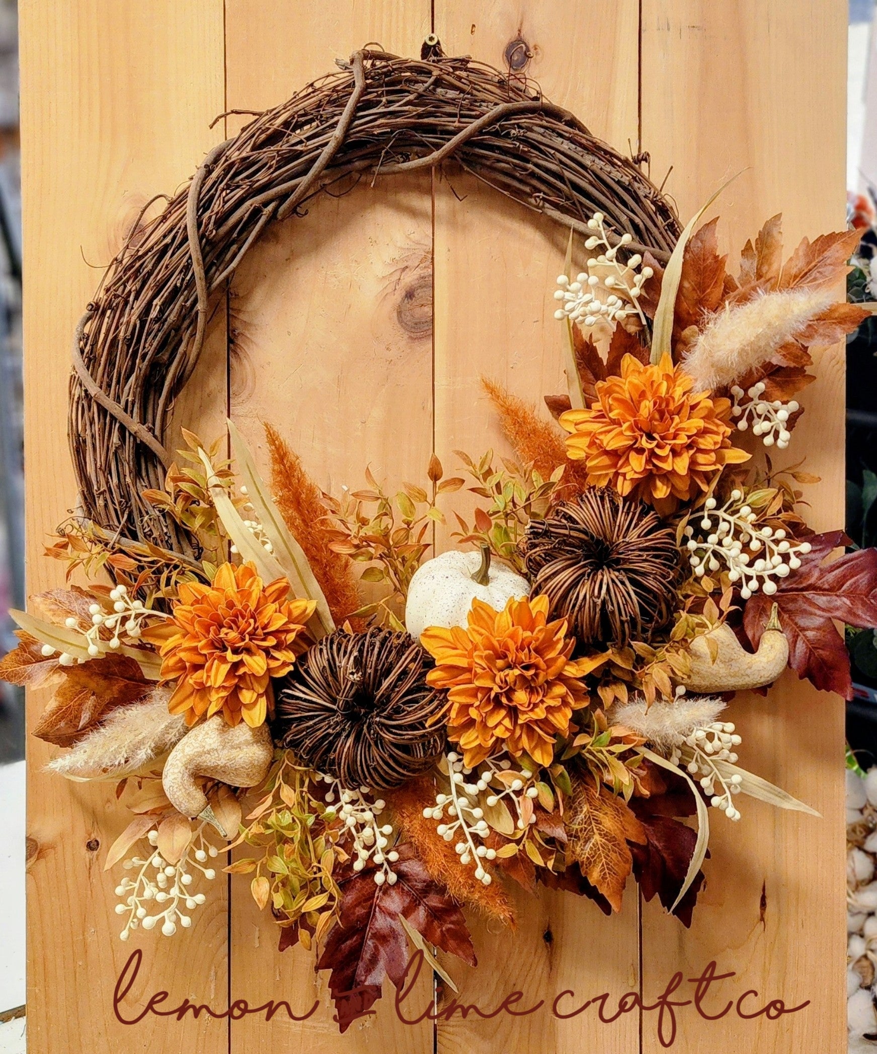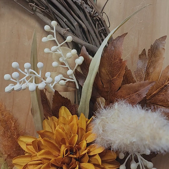 These colors for Fall are some of our favorites, remaining a very popular trend over the last several years. It's truly one of our favorite color schemes for Fall. This wreath is simple, yet elegant, in its style with a theme that will last you all season long. Add this wreath to your decor this Fall!