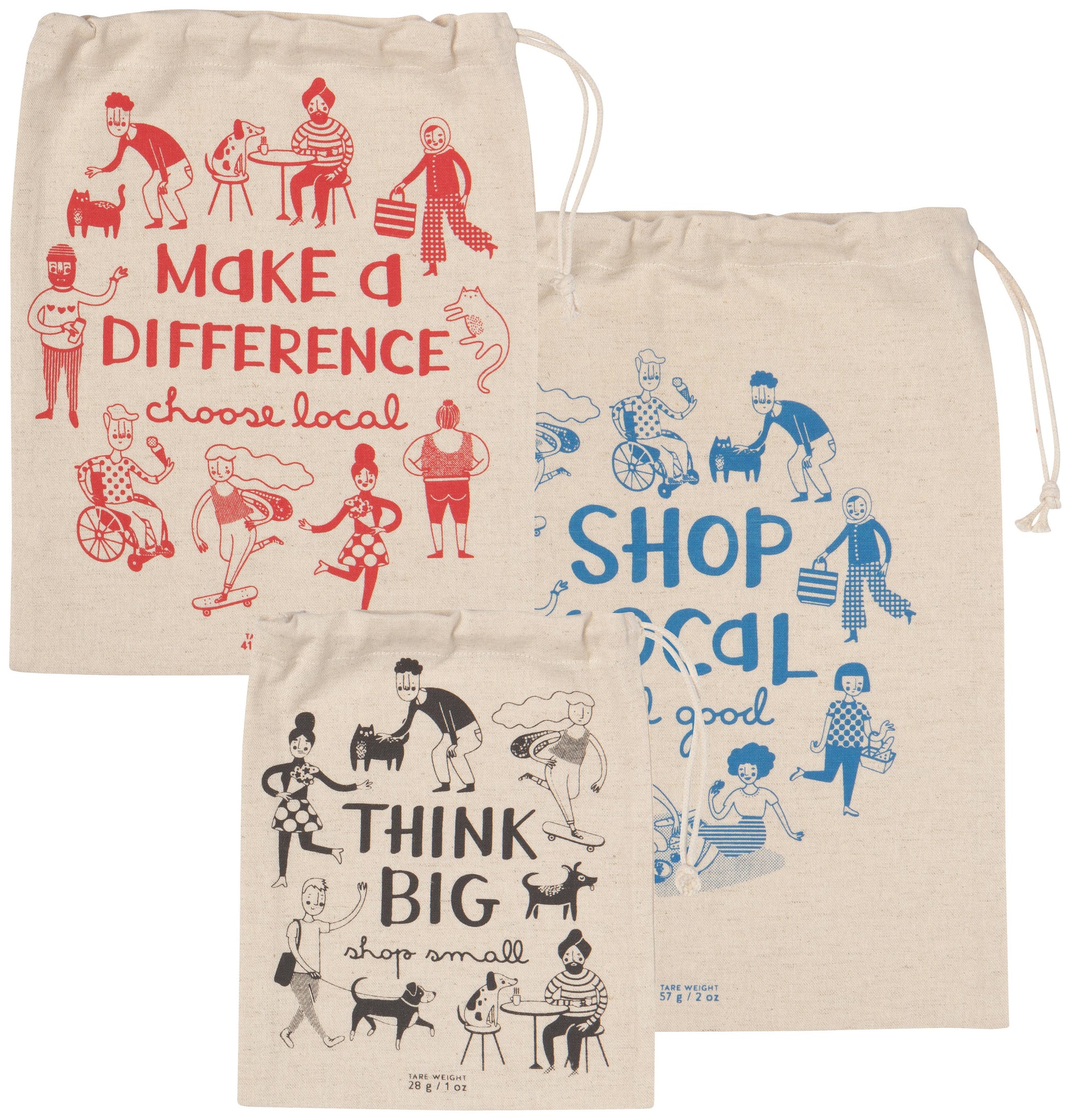 Encourage everyone around you to support small businesses with the Shop Local Produce Bags by Now Designs. Neutral backgrounds and bold messages each of the three bags show your appreciation and inspire others to do the same. Size: W8.5 x L10.5 / W10.25 x L12.5 / W12.5 X 16in Material content: 100% Cotton Care instructions: Machine wash cold, line dry