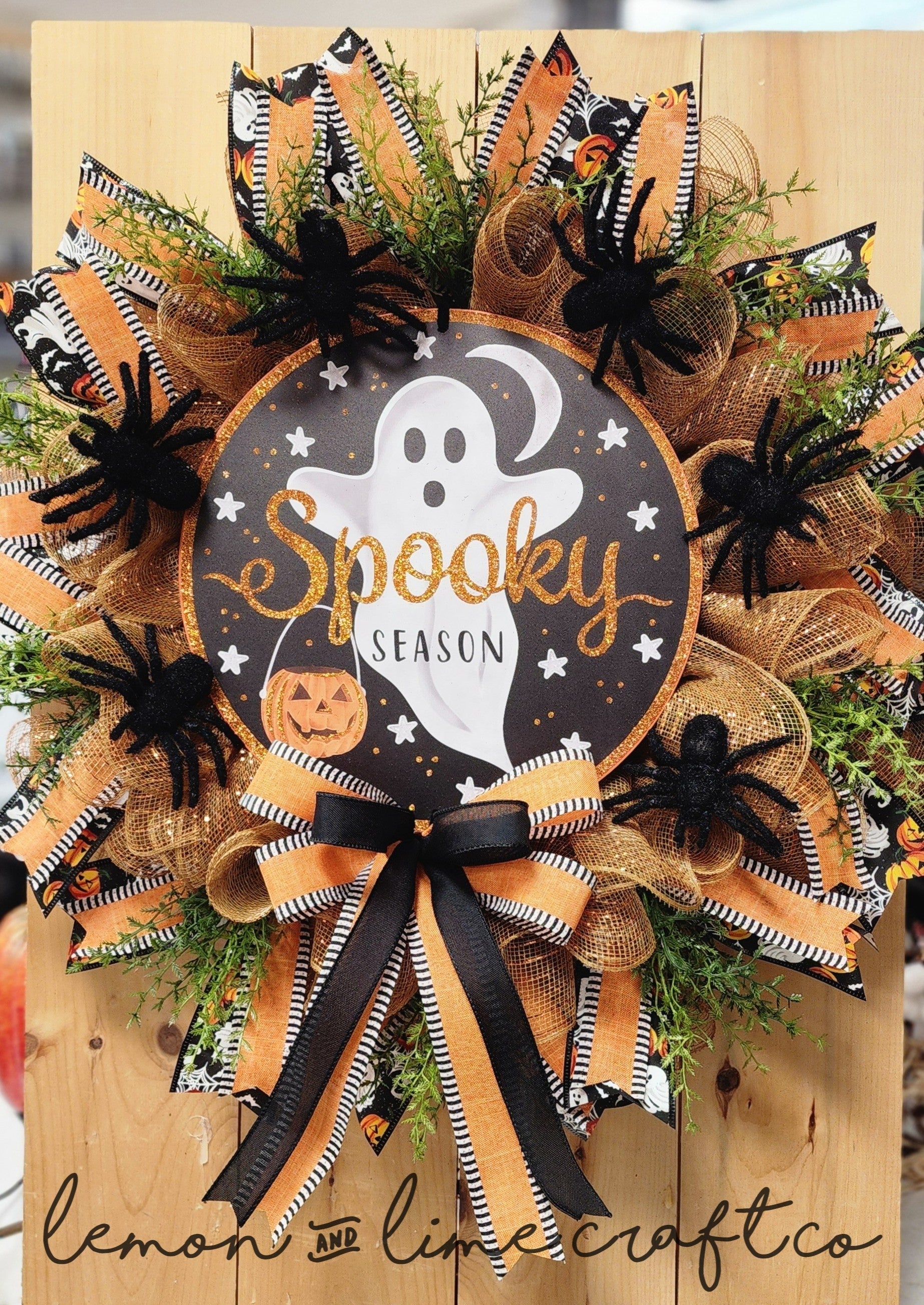 Is Spooky Season your favorite season? Add this little cutie to your decor! This wreath features a metal sign sitting front and center with complimentary ribbons all along the outside with a bow sitting at the bottom. Flocked spiders adorn the perimeter of the sign as well for an extra spooky effect!