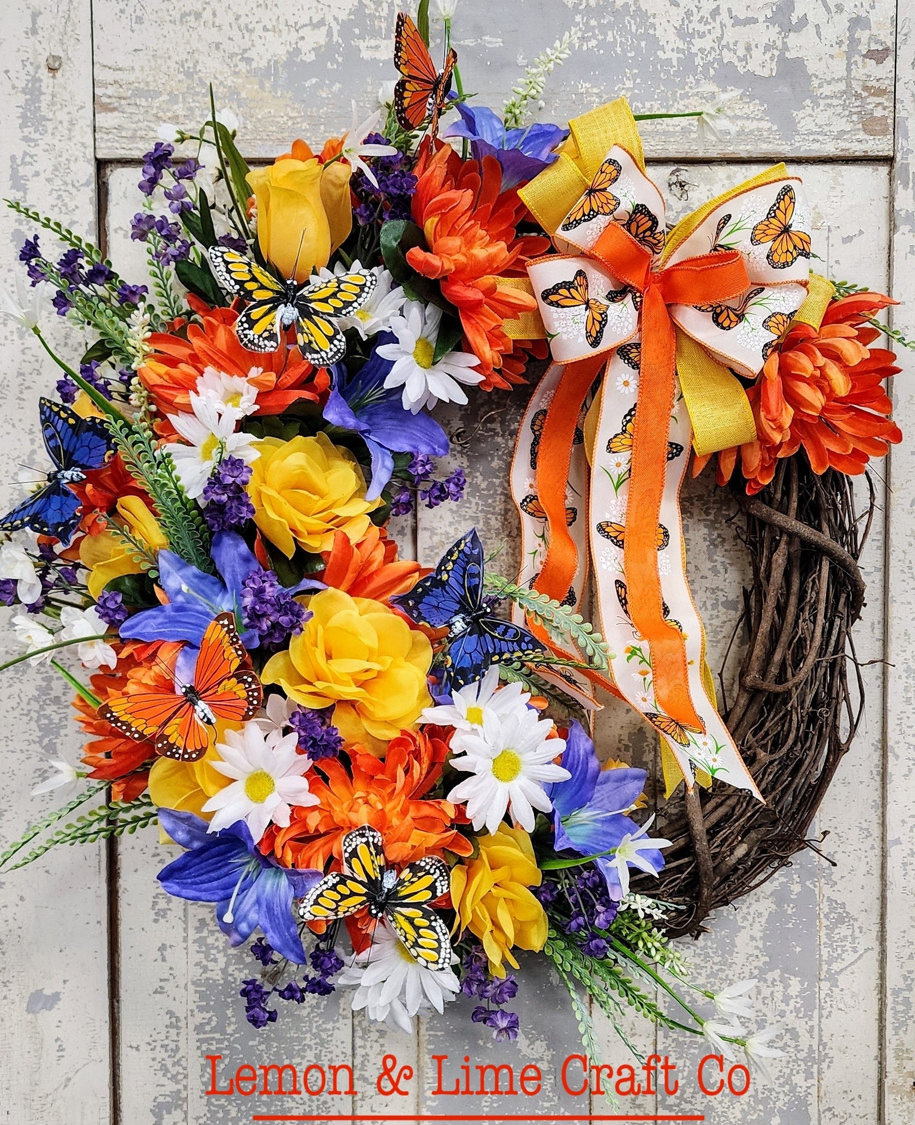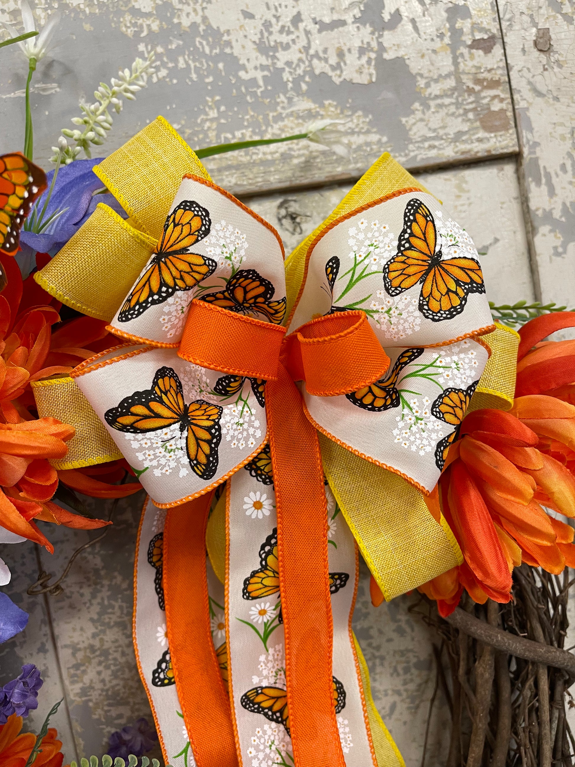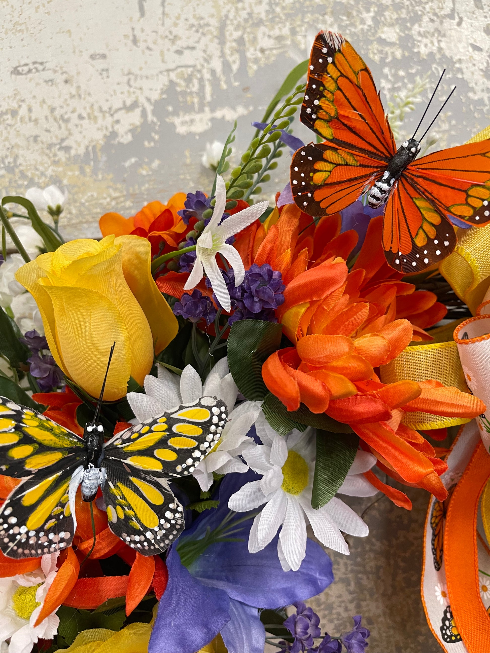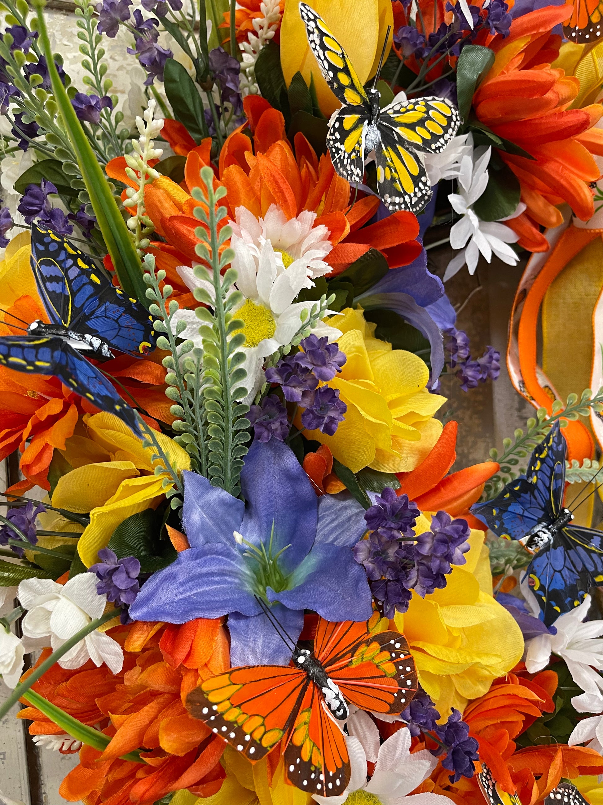Experience the beauty of summer with our vibrant Summer Bufferfly. Featuring a 14" grapevine base adorned with orange, yellow, and purple flowers plus summer daisies and greens, as well as fluttering butterflies. Embrace the season with this stunning addition to your home decor.