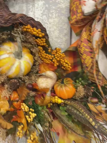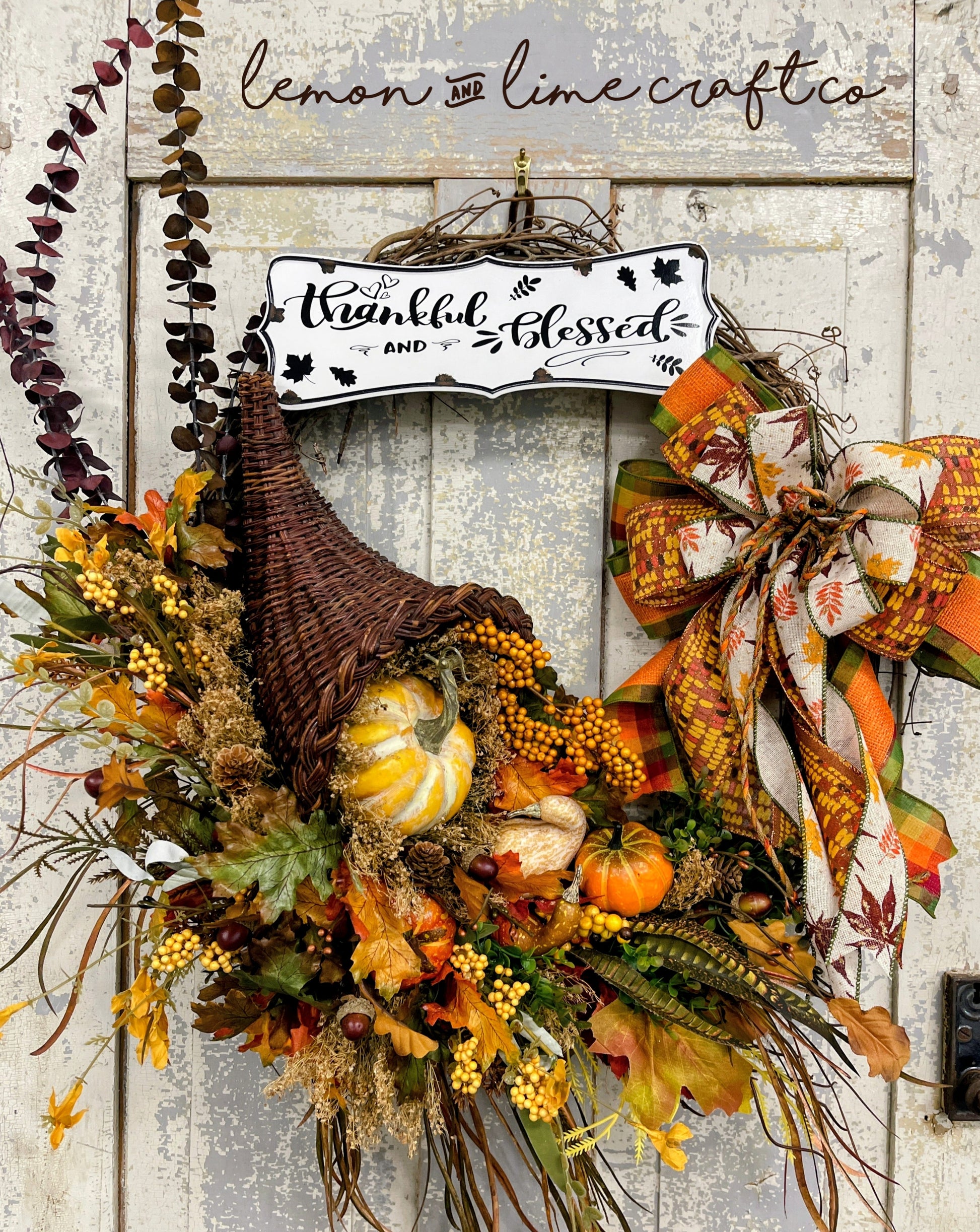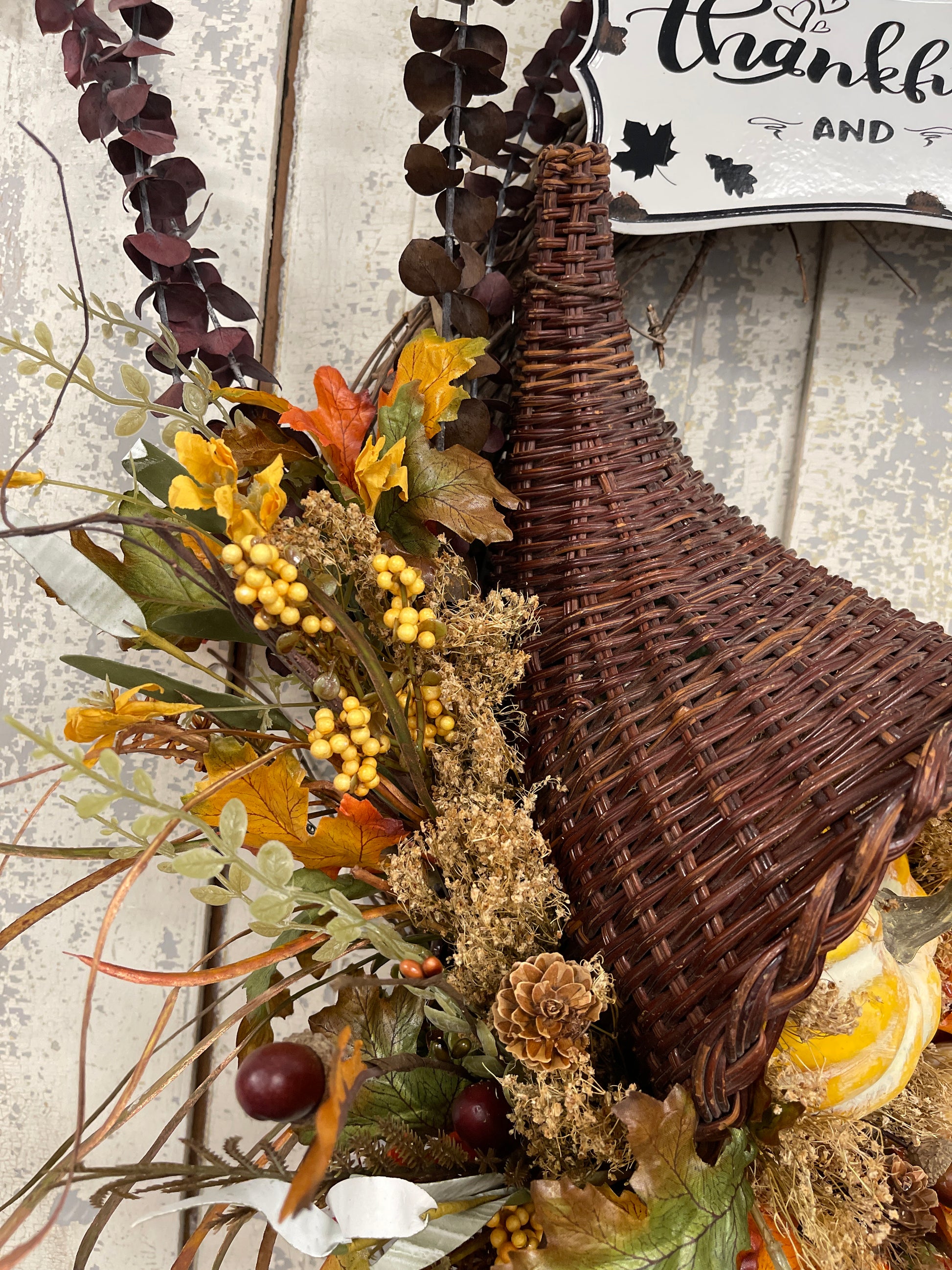 Experience the beauty of autumn with our Thankful and Blessed wreath. Adorned with a cornucopia filled with all of autumn's splendor, including pumpkins, acorns, fall leaves, and berries, this wreath will add a touch of warmth and gratitude to any space. Show your appreciation and decorate with Thankful and Blessed.